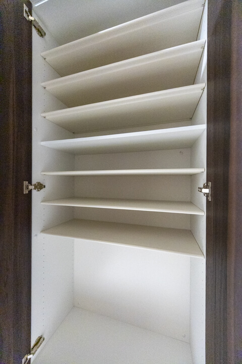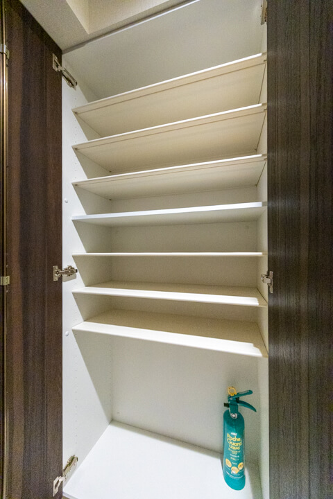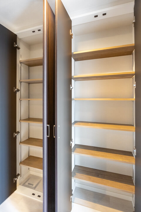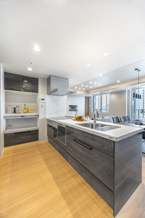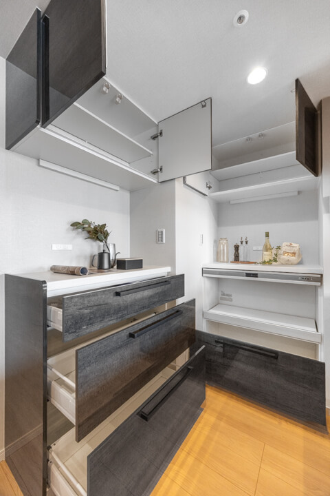 2つのカップボードが備え付けで、収納性に優れています。キッチンと同じデザインで統一感がありますね。食料品のストックや食器類を整理整頓でき、ごちゃごちゃしがちなキッチンまわりがすっきり片付きそう。家電使用に便利なトレイボード付きなのも嬉しいポイントです。