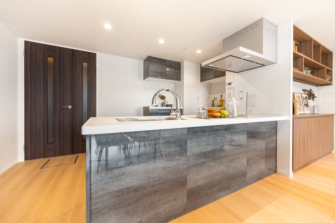 シックなデザインが印象的なキッチン。リビングダイニングを見渡せる人気の対面タイプです。開放的な気分で調理ができ、家族の会話が弾みそう。コンロ前には油跳ねガードが設置されていて安心です。
