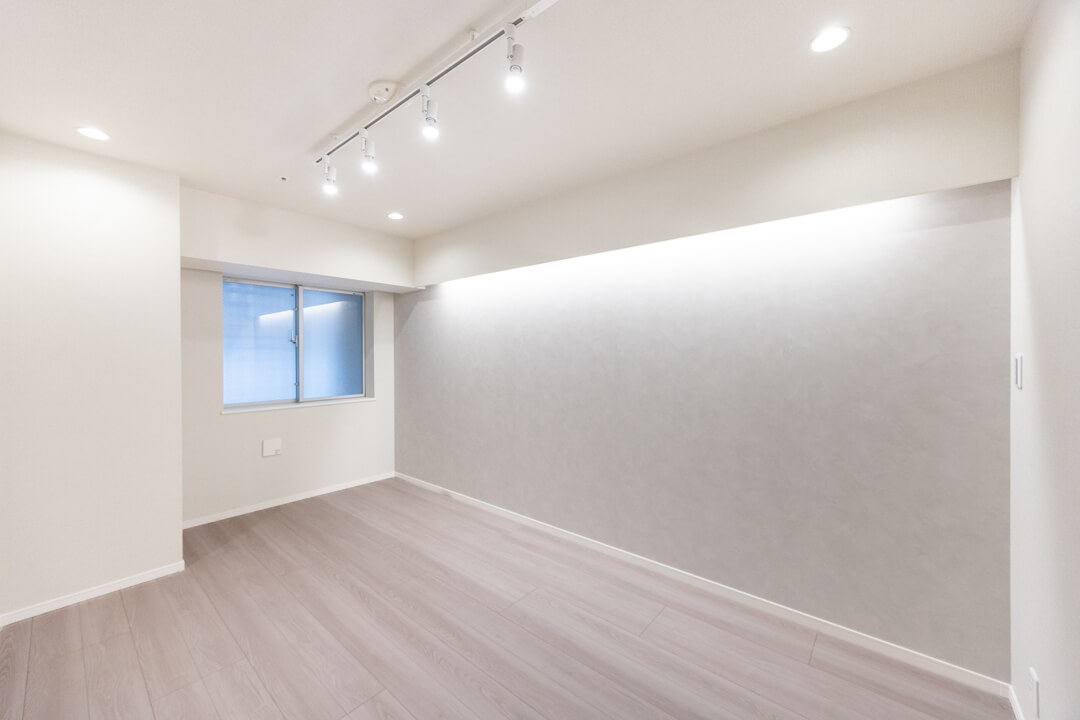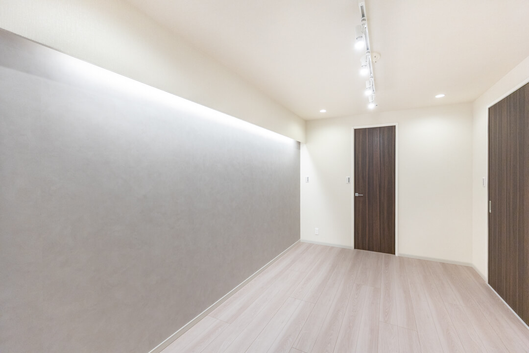 約7.7帖の洋室1。さりげないアクセントクロスと間接照明が落ち着く空間を演出します。シングルベッドを2台置ける広さがあり、主寝室にぴったりですね。