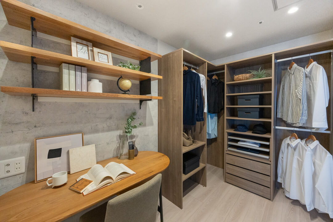 LDKに隣接する約4.0帖のサービスルーム。クリアブラックのスライドドアを採用し、スタイリッシュさと、ほど良いこもり感のある空間です。オープン仕様のシステム収納があり、収納充実◎。扉がないので出し入れしやすく、見せる収納を楽しめます。飾り棚付きなのも魅力的ですね。ワークスペースや趣味部屋にぴったりの空間です。
