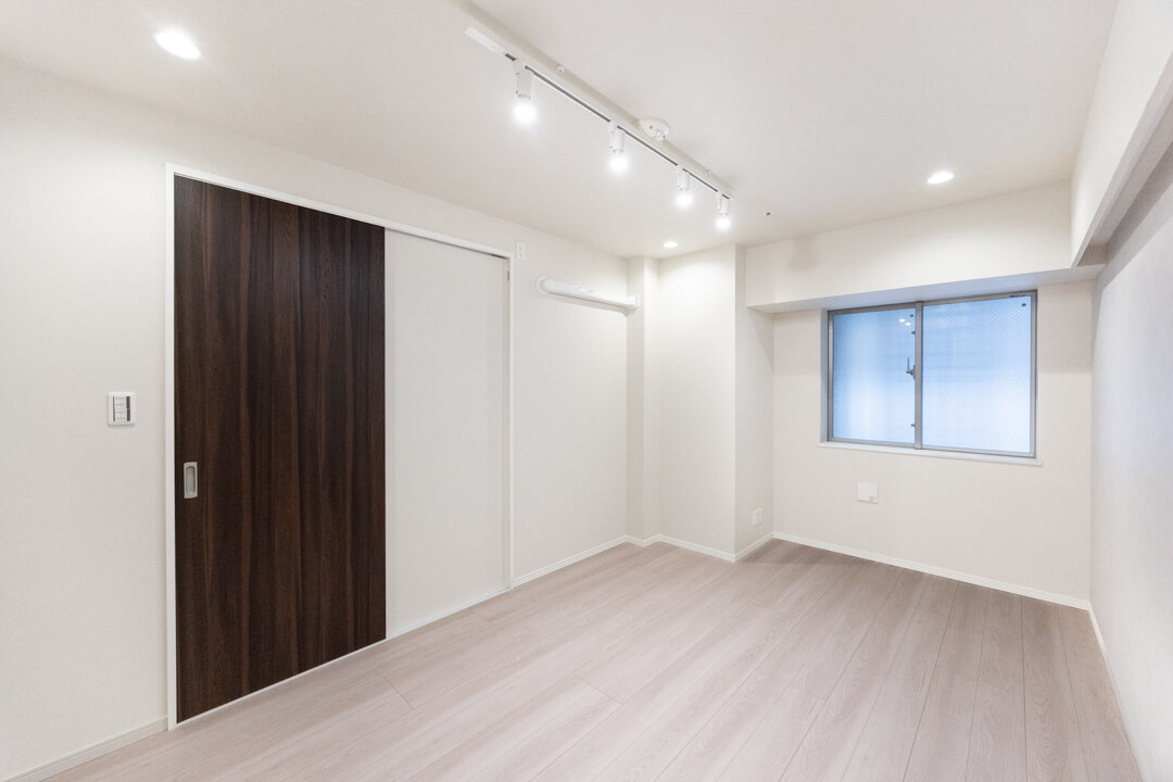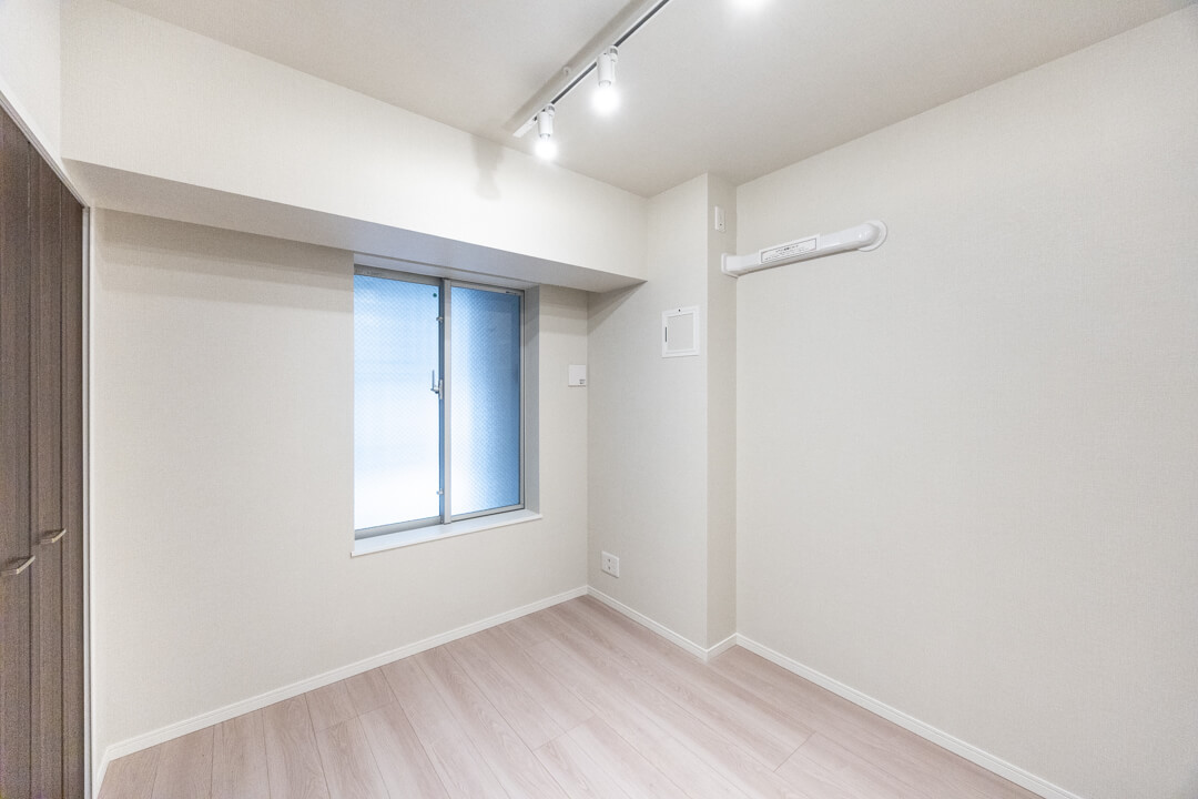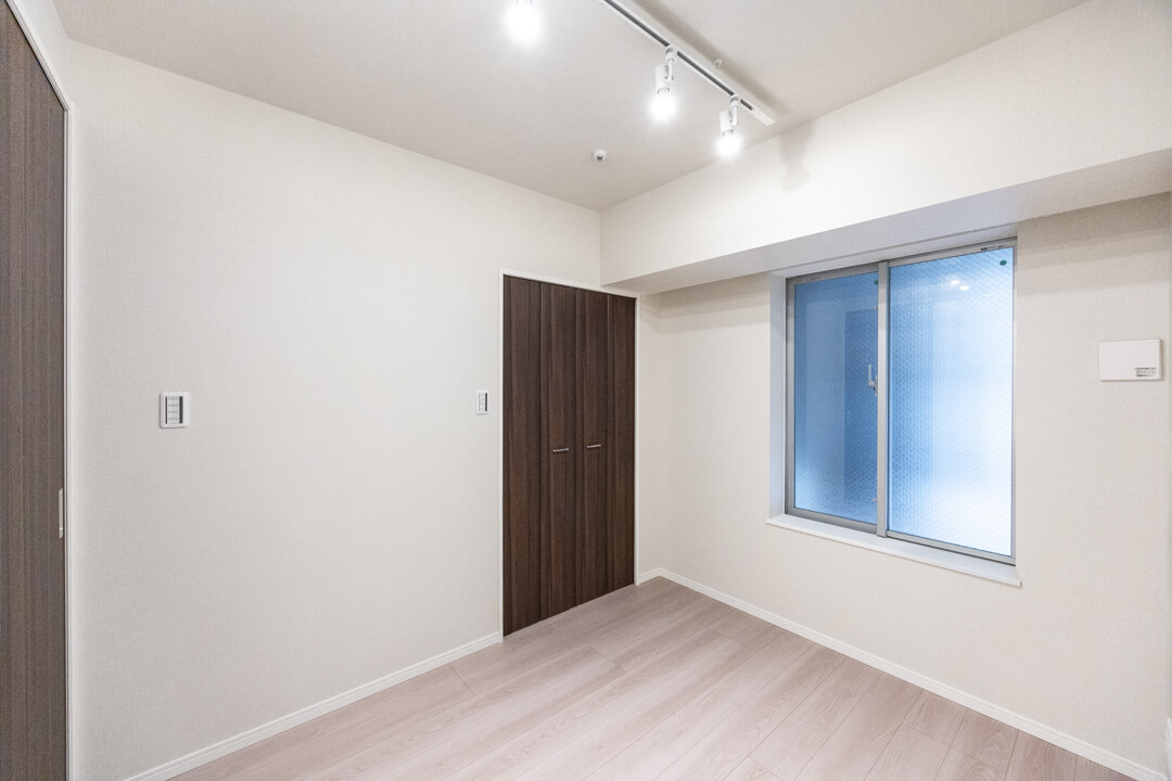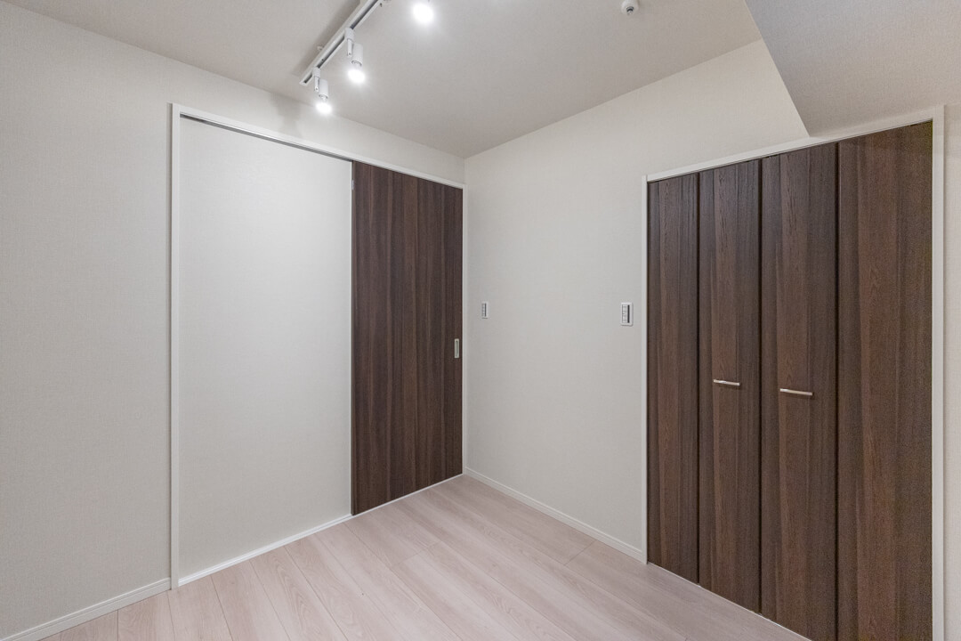 約4.1帖の洋室2。窓&クローゼット付きで使い勝手の良い空間です。4枚折れ戸のクローゼットは開口部分が大きく、荷物を出し入れしやすいのが嬉しいポイント。お部屋の扉には引き戸を採用していて、開け閉めにスペースを取りません。動線の邪魔にならず、家具レイアウトの幅も広がりそうですね。