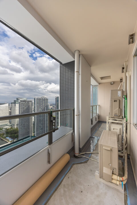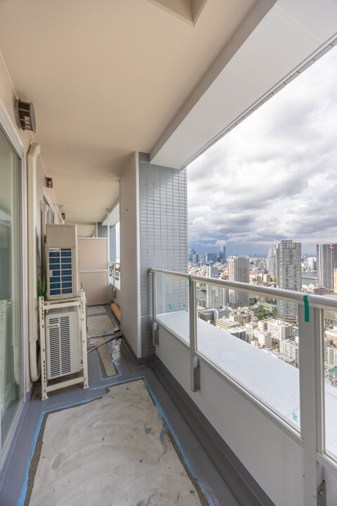 LDKに面するバルコニー。9.54㎡の広々としたスペースです。55階部分につき眺望良好◎。運河の潤いと木々の緑、都会らしい眺めが広がります。ビルの間からはスカイツリーが見えました(※天候によります)。