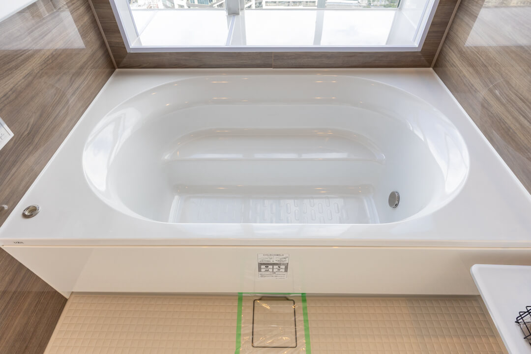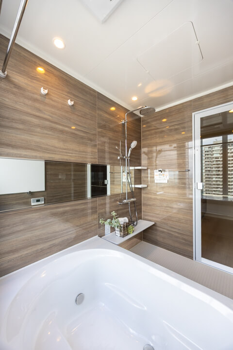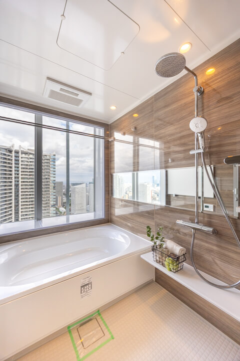 ゆったり入浴できる1620サイズのビューバス。夜景を楽しみながら、癒しのバスタイムを過ごせます。浴室乾燥機・追い焚き機能搭載で、設備も充実。シャワーは2種類設置されています。全身でシャワーを浴びることができるオーバーヘッドシャワーには高い保温効果が◎。用途によってハンドシャワーと使い分けてください。