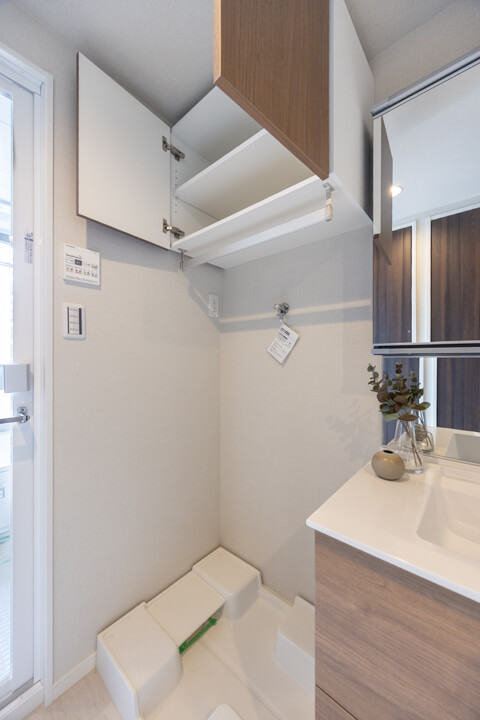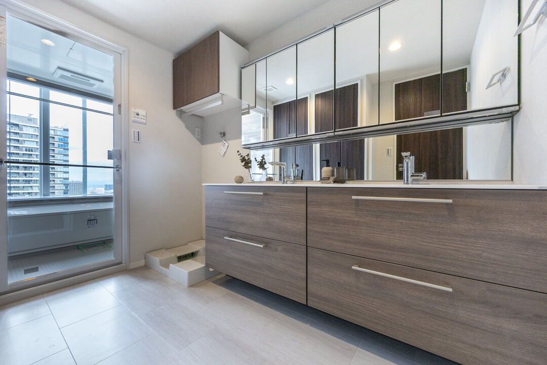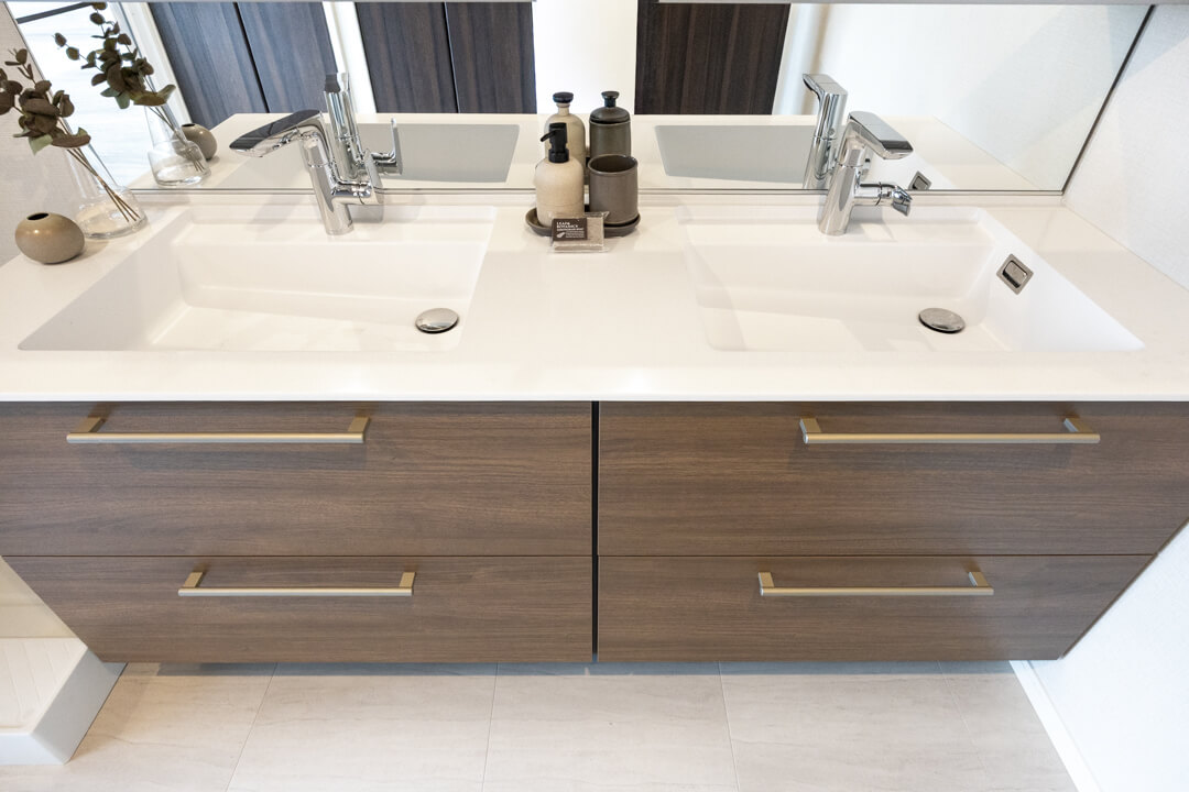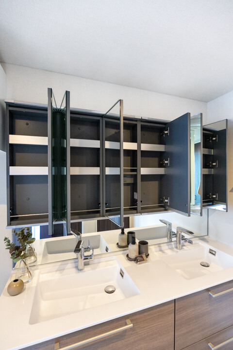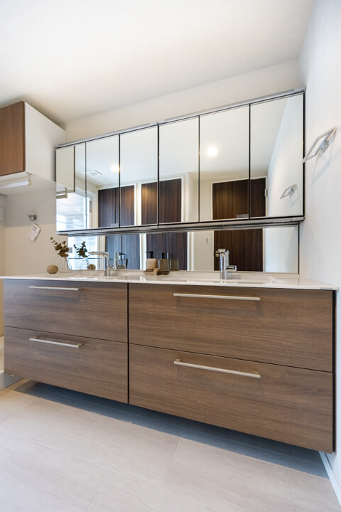 浴室の窓から光が入る、開放的な洗面室。ゆとりある2ボウル仕様の洗面化粧台を完備しています。2人同時に使用でき、忙しい朝の身支度もスムーズ。ミラーボックスに足元の引き出し、リネン庫など、豊富な収納も魅力的です。洗面まわりの小物からタオル・パジャマ類までたっぷり収納でき、いつも清潔な洗面室をキープできそうですね。