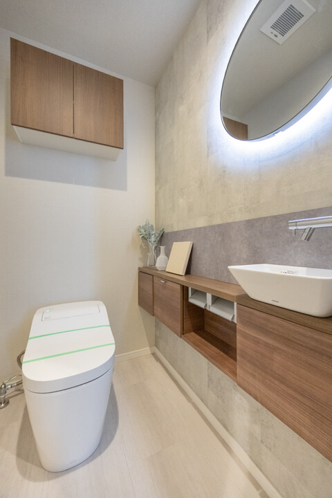 廊下に面していて独立性の高いレストルーム。Panasonic製の洗浄機能付トイレに交換済みです。タンクレス仕様でスタイリッシュ。手洗いカウンター付きなのですぐに手を洗うことができ、ゲストを洗面室まで案内する手間もかかりません。間接照明付きの丸いミラーが洗練された空間を演出します。