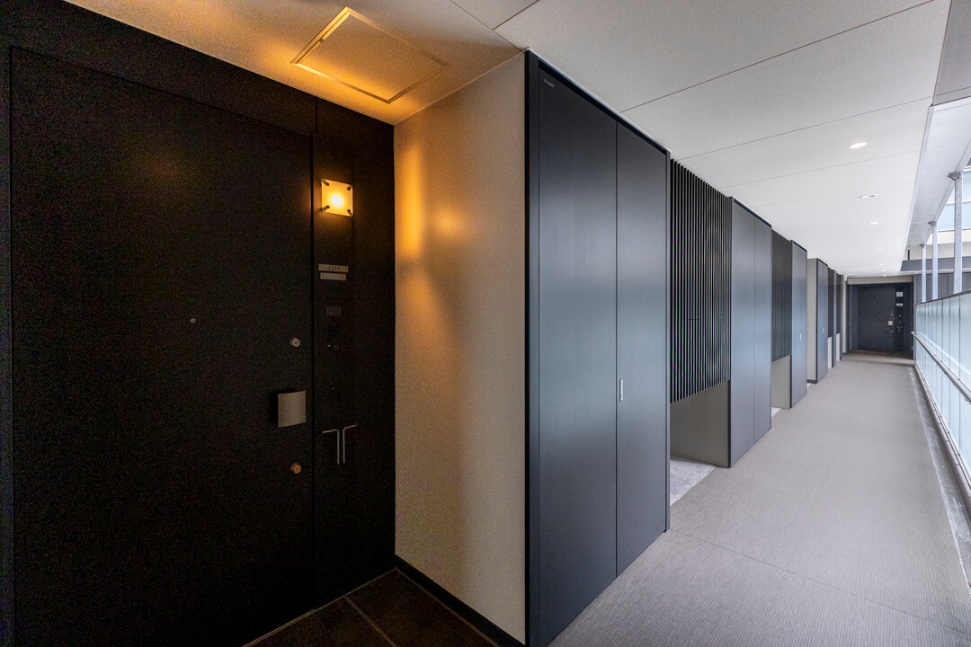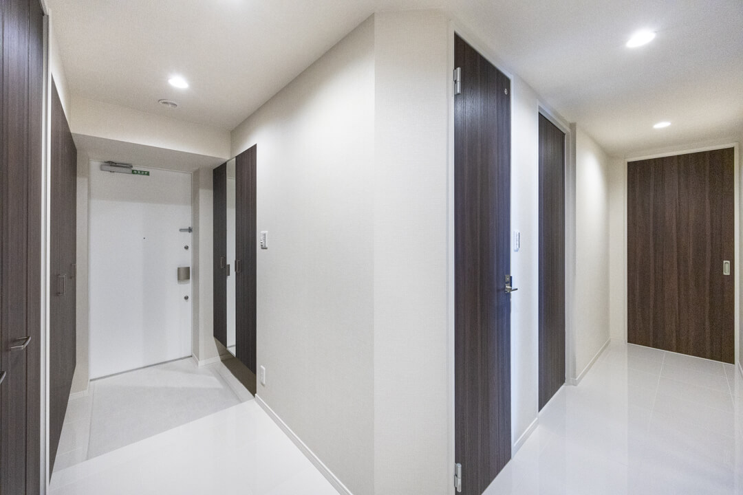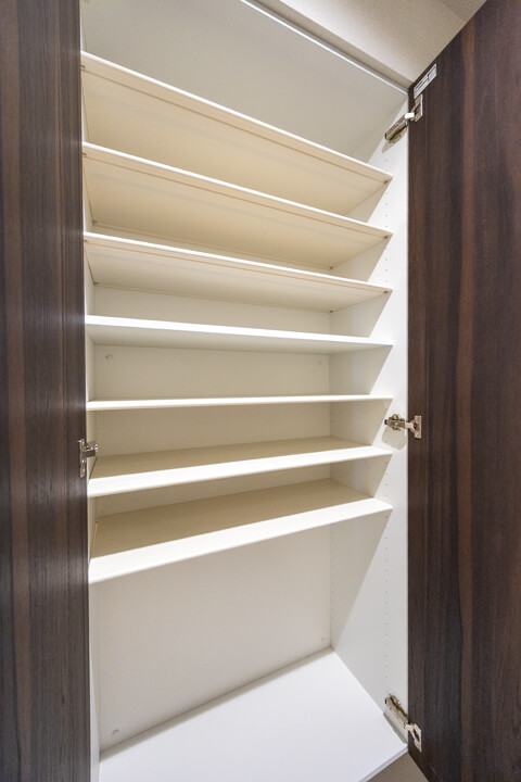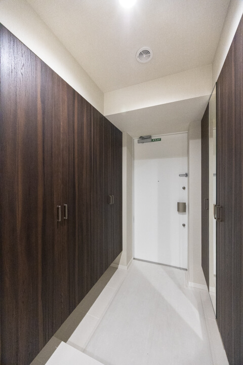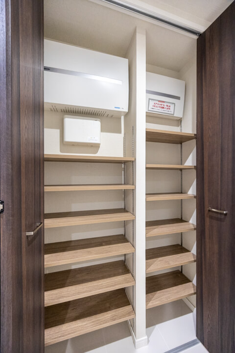 人感センサー搭載でいつも明るく出迎えてくれる玄関。荷物で両手が塞がっている時や夜遅く帰宅した時に、スイッチを探す手間がかからず助かります。左右にシューズボックスが並び、収納力◎。ロングブーツやレインシューズも収納でき、いつも清潔な玄関をキープできそうです。扉の一部が鏡張りになっていて、お出かけ前のコーディネートチェックができるのも嬉しいポイントです。廊下にも物入があり、ペットグッズや日用品ストックの収納に便利ですよ。隣の飾り棚にはお気に入りの写真や小物を飾り、自分好みの空間づくりをお楽しみください。