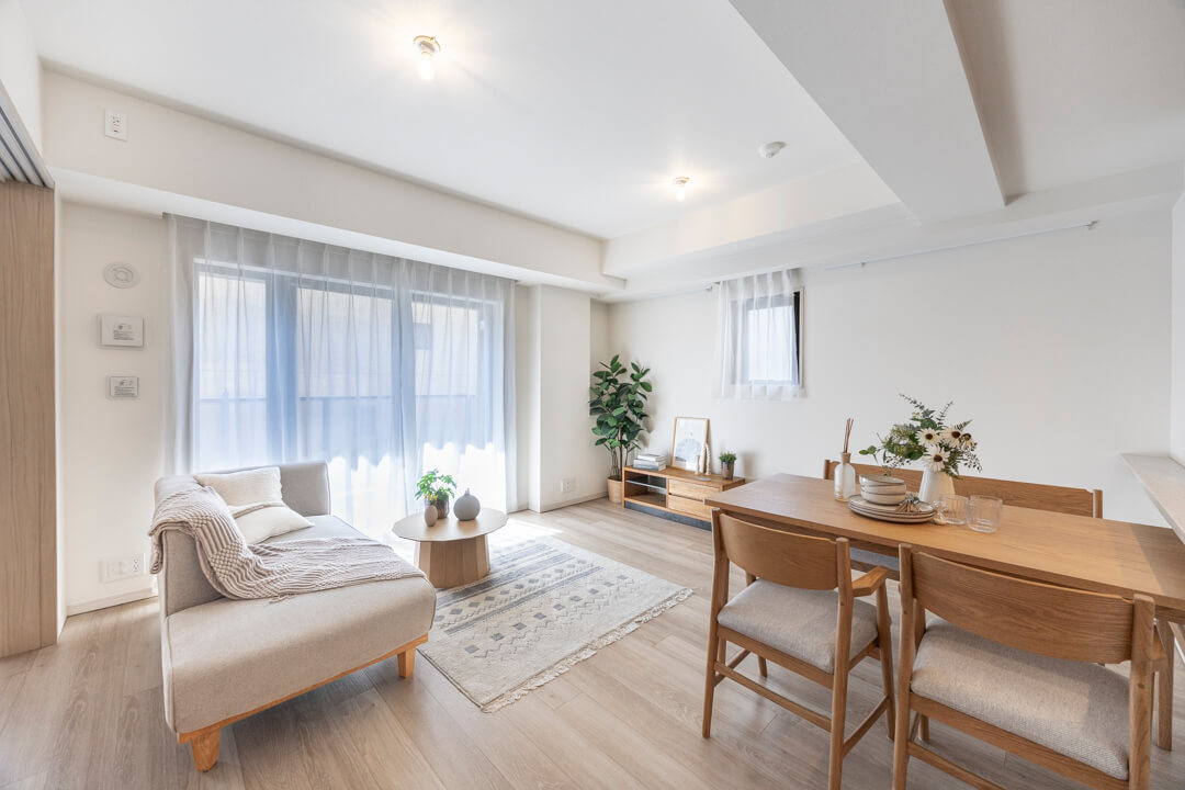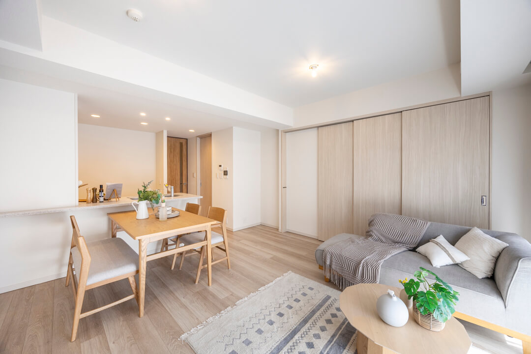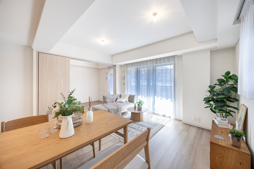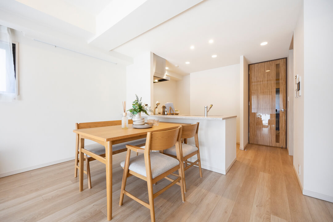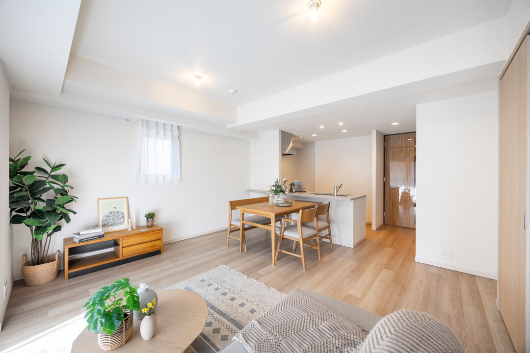 約16.0帖の広々としたリビングダイニングキッチンです。二面採光で南東向きのため日当たりが良好。壁面にはピクチャーレールが設置されていて、絵画やグリーンなどが飾りやすくなっています。