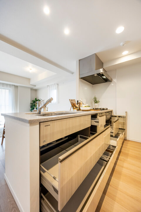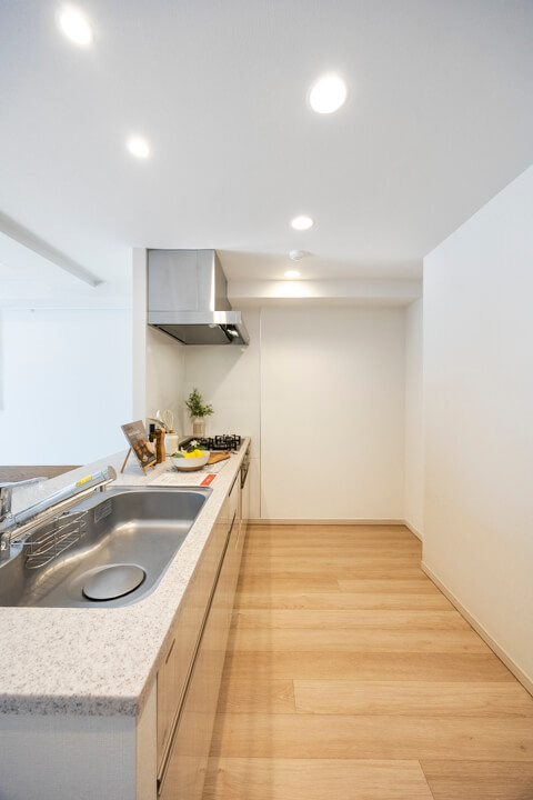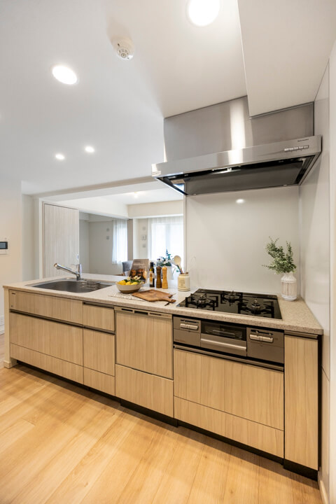 キッチンは、リビングダイニングを見渡しながら料理ができる対面式です。家族や来客とのコミュニケーションが取りやすくて◎。しかし、コンロ側には壁がたっているので、油跳ねなどの心配はありません。