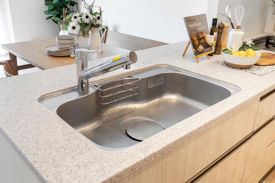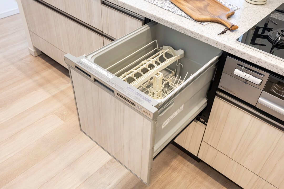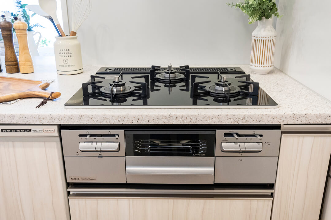 3口コンロ、グリル、食洗機付きと設備面も充実しています。シンクも広々としているので野菜などが洗いやすそうですよ。