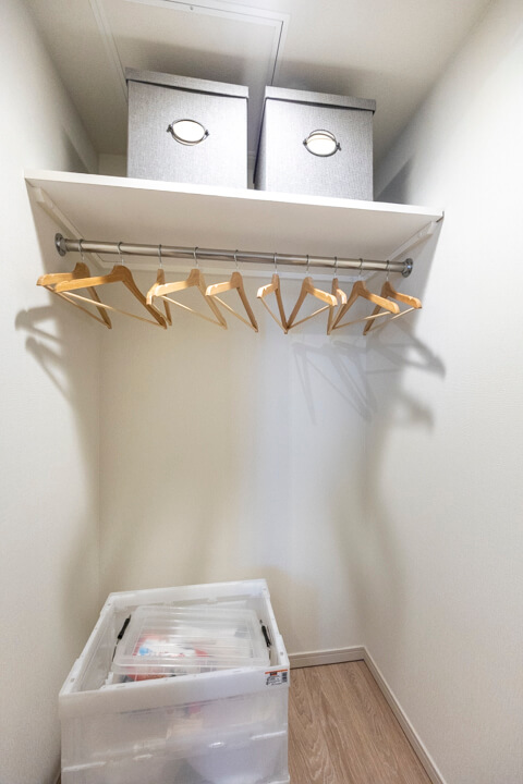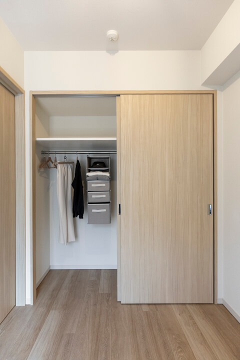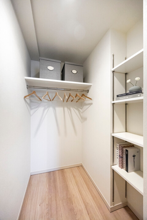 約6.0帖の寝室1はゆとりがあって主寝室に良さそうなお部屋です。共用部に面していますが、すりガラスになっているのでプライバシー面に配慮されています。また、奥行きがあるウォークインクローゼットが造られています。中にはハンガーパイプや可動棚が設置されており、洋服や小物などもすっきりと収納できます。