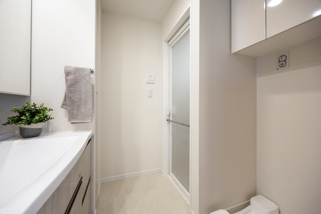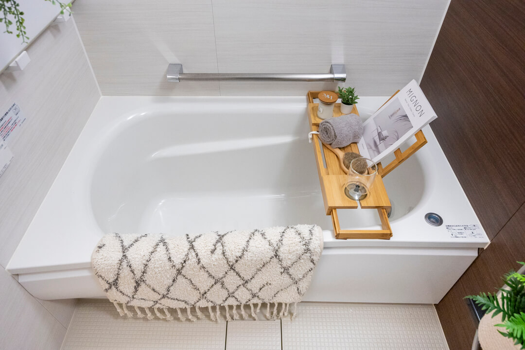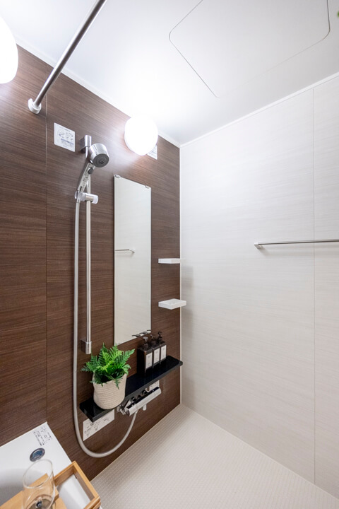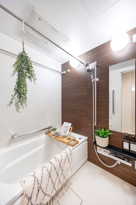 ブラウンの壁パネルが落ち着いた雰囲気を演出してくれている浴室です。お風呂にゆっくり浸かるのが好きという方に嬉しい追い焚き機能を搭載。家族の入浴時間がずれてしまっても安心です。また、浴室乾燥機には暖房・乾燥・換気・涼風の機能がついており、一年中快適に過ごすことができます。