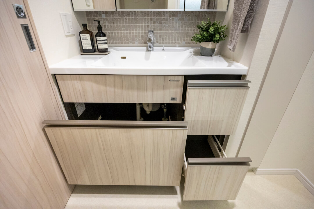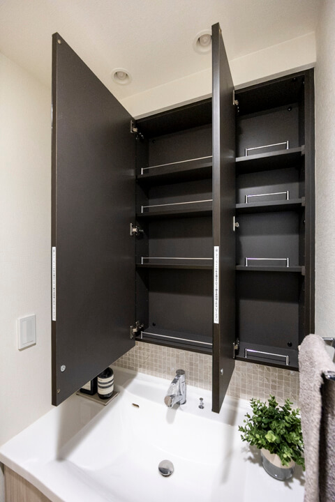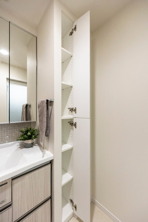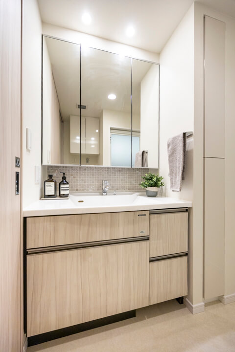 優し気な色合いのタイルが印象的な洗面化粧台です。三面鏡の中に化粧品などが収納できて使い勝手が良好。洗面ボウルとカウンターは継ぎ目がないタイプで、お手入れも簡単です。また、横にはリネン庫も造られています。
