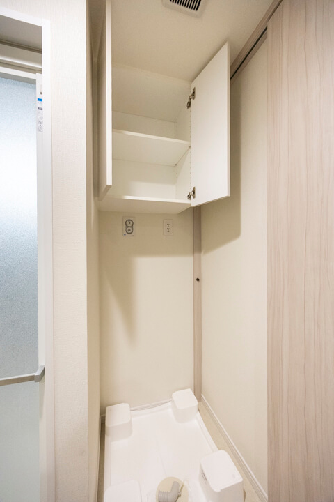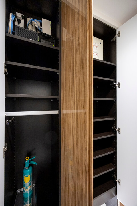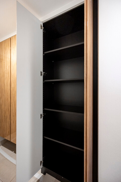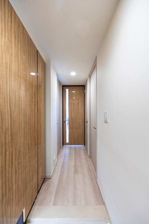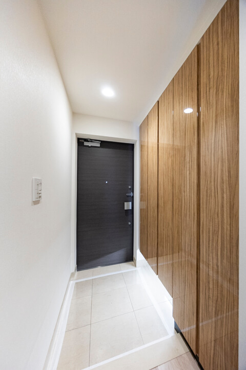 玄関入って左側にはシューズボックスが備え付けられています。高さがありますが、フロートタイプのため空間に圧迫感を与えません。フットライトが優しく足元を照らしてくれますよ。