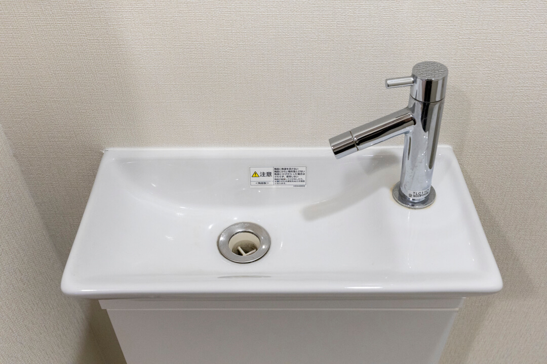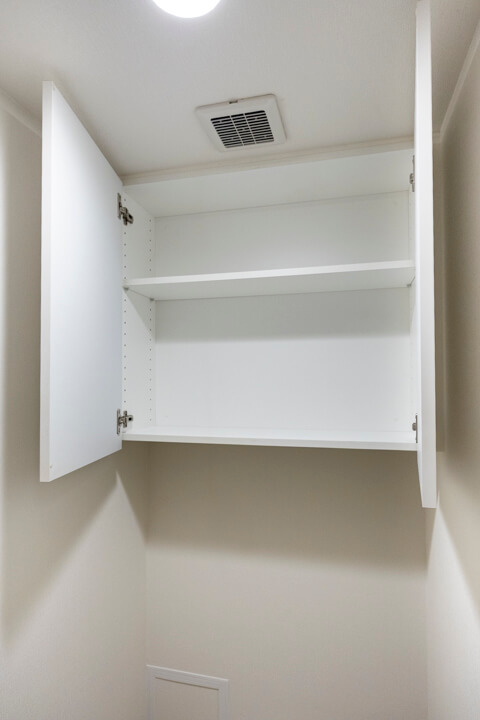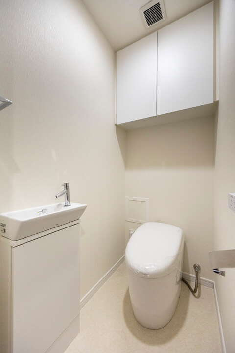 ウォシュレット一体型のトイレです。タンクレスタイプなのですっきりとした印象に。また、別途で手洗い器が造られているので、すぐに手を洗うことができて衛生的です。上部には吊戸棚が設置されていて、収納スペースもありますよ。カウンタースペースにはアロマなどを置いても◎。