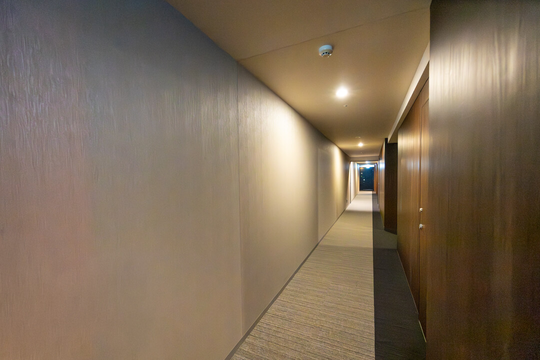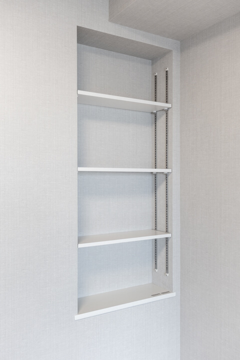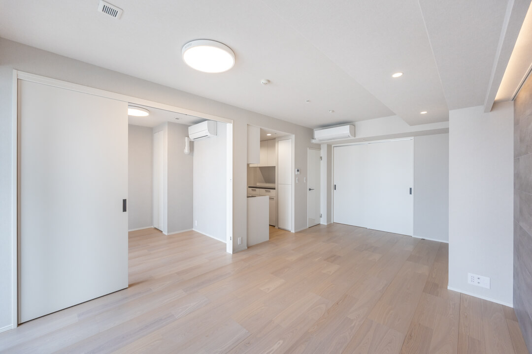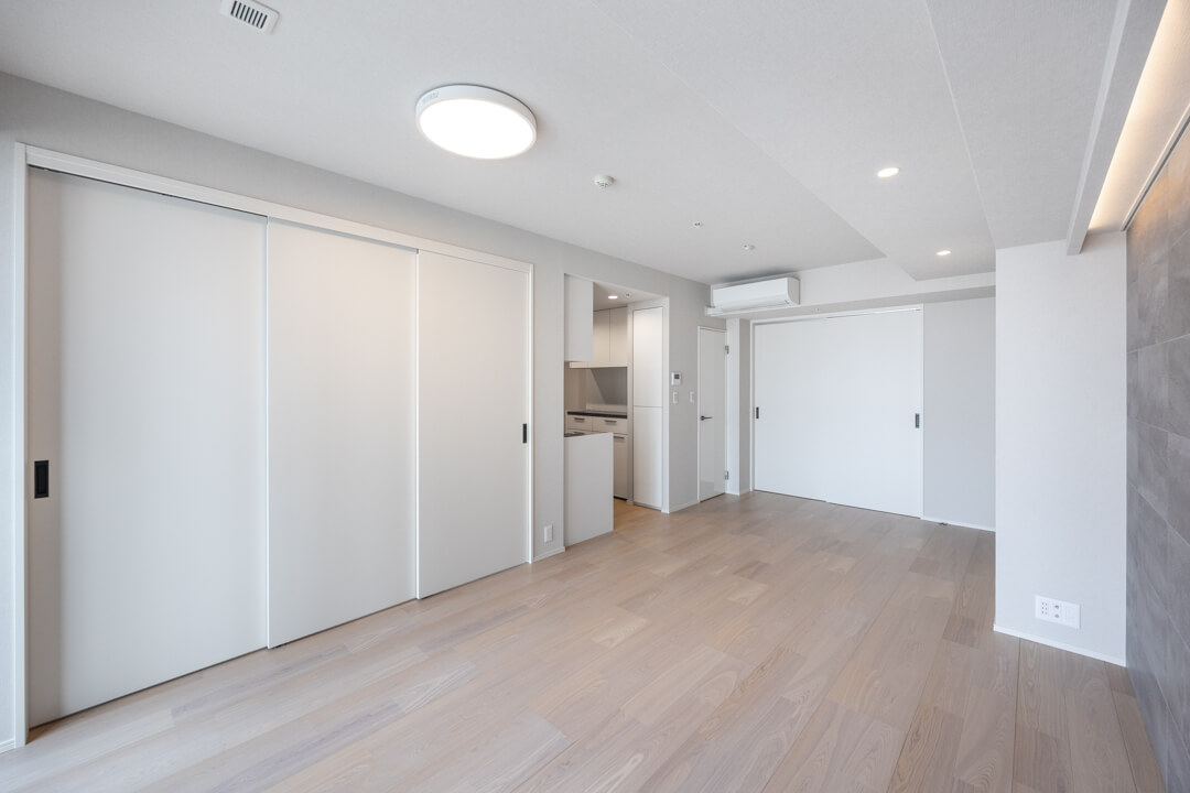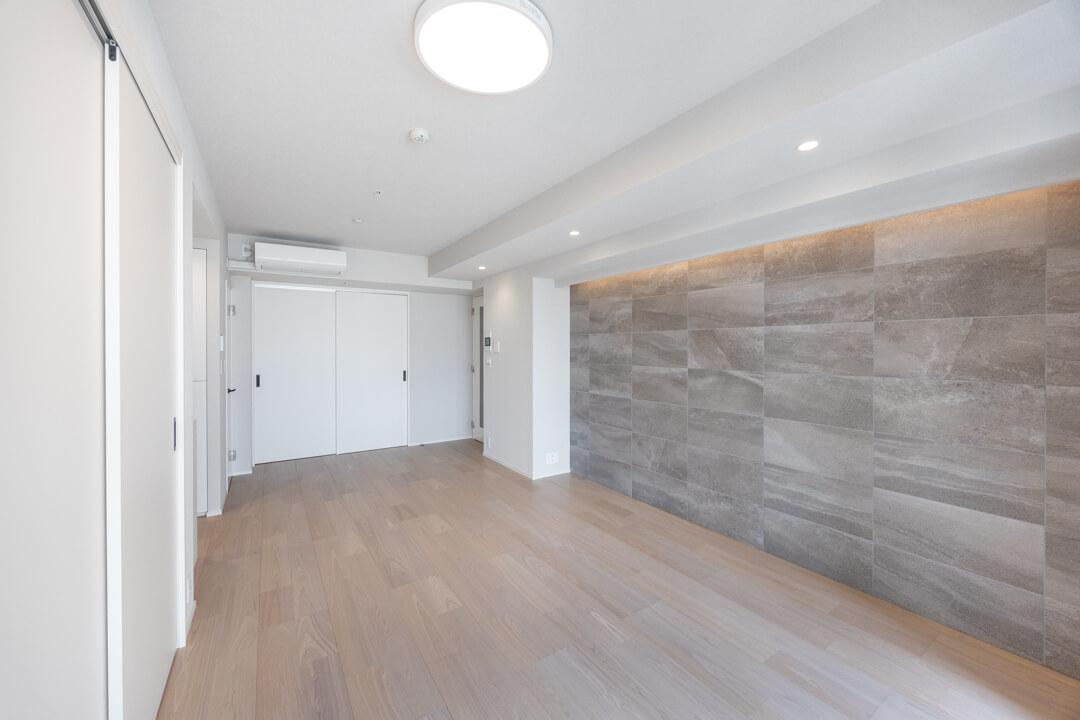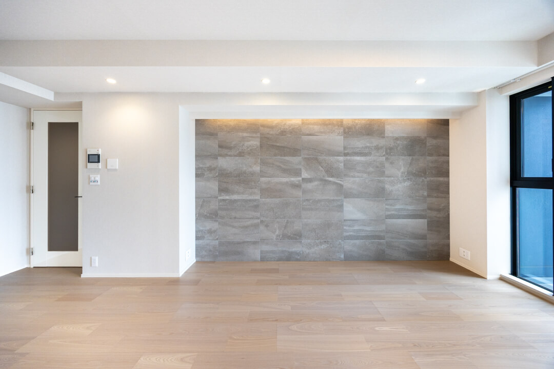 キッチンスペースを含め、約15.1帖のLDK。リビングとキッチンスペースが空間分けされており、生活感を感じさせないすっきりとした印象です。また、石目調のアクセントウォールで上品な雰囲気も感じられます。間接照明付きで空間の演出性も高めてくれます。リビングの一角には収納スペースも施されています。