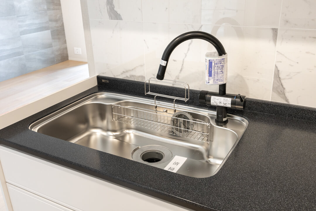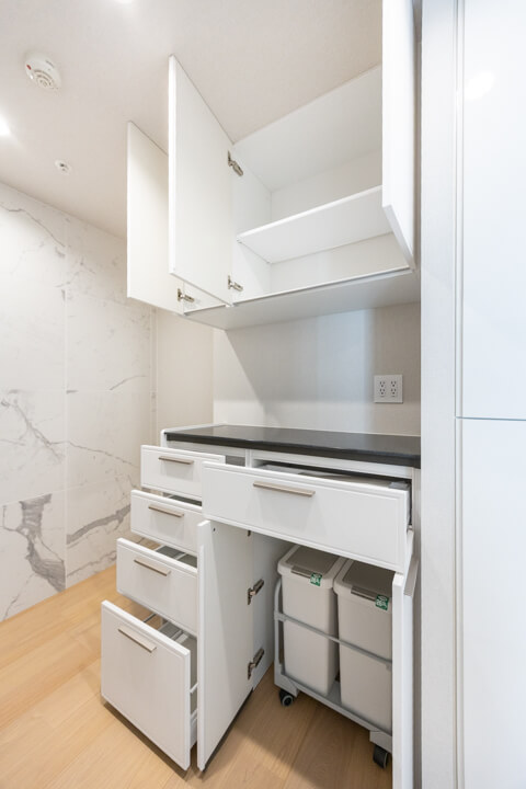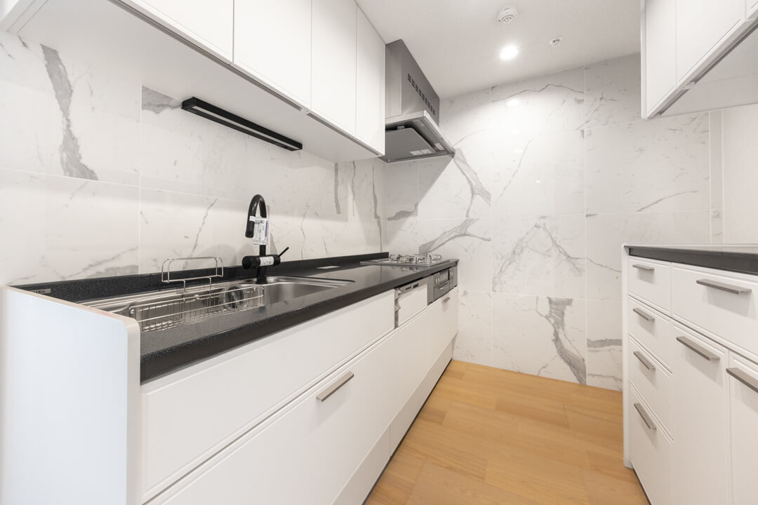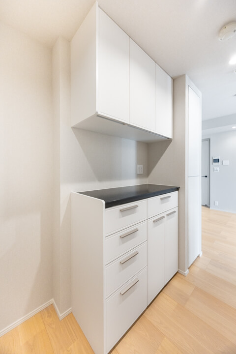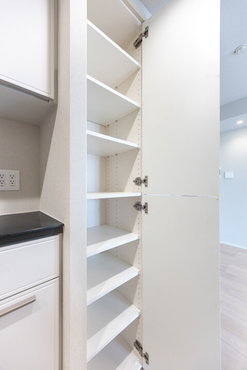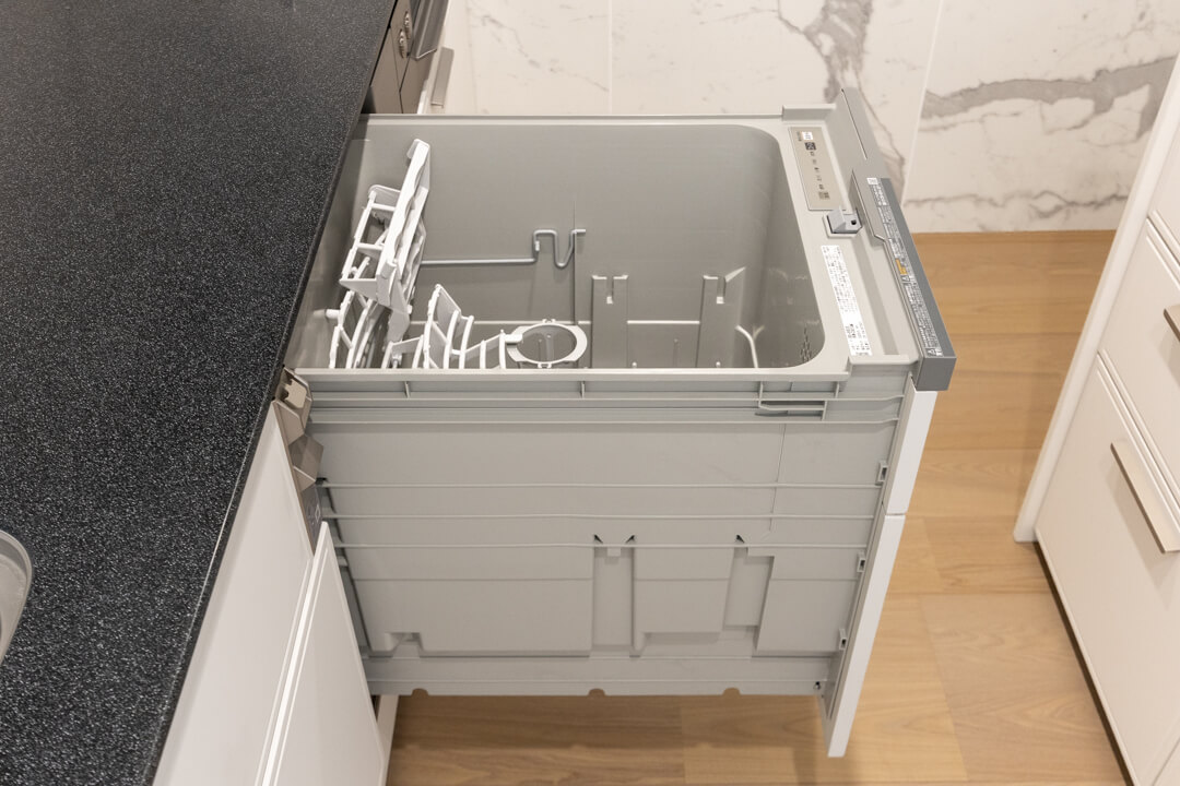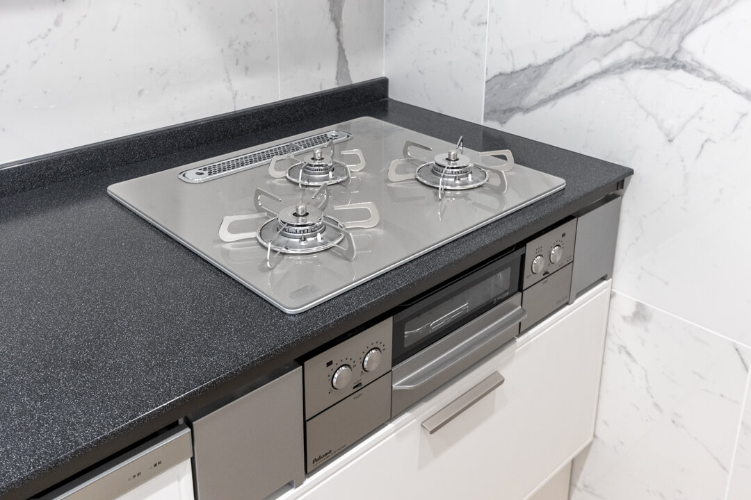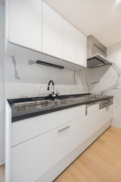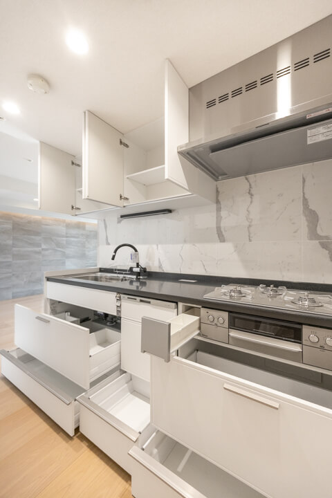 リビングダイニングと空間分けされているキッチンスペース。キッチンまわりの生活感をさりげなく目隠しできます。料理が捗る3口ガスコンロ、家事の時短に心強い食洗機、生ごみの処理に便利なディスポーザー付きで設備も充実。カップボードに加え、別途収納スペースも備わっています。