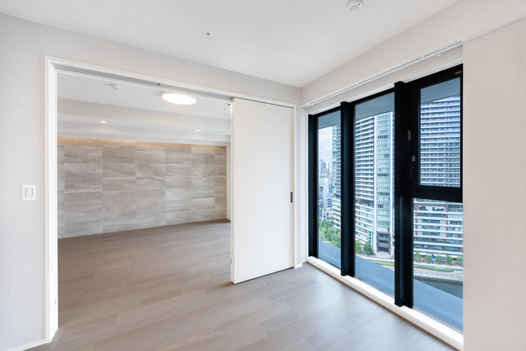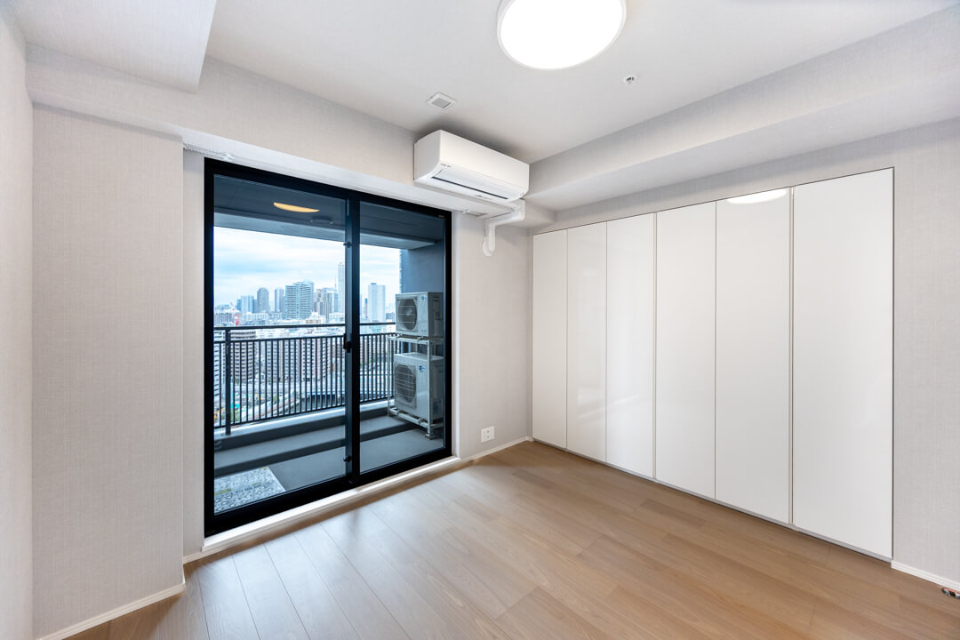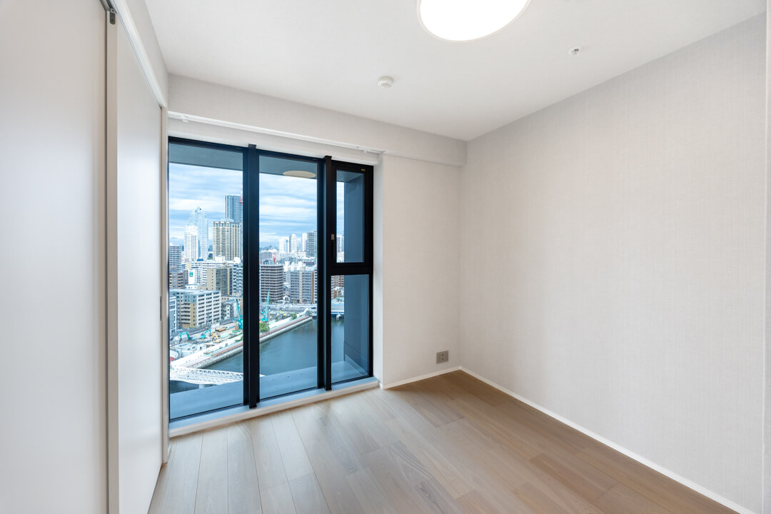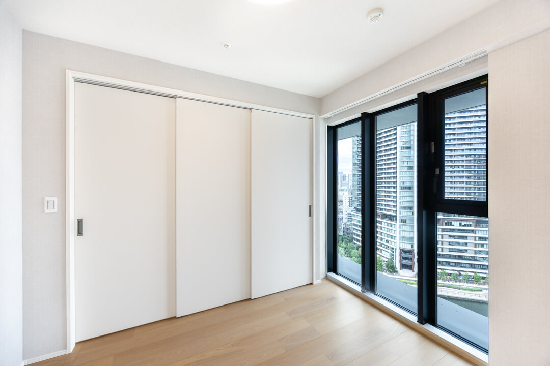約5.0帖の洋室3。開放的な景色が望める大きな窓があるお部屋。ドアの開口部が広く取られており、リビングと繋げてより広々と過ごせます。クローゼットも備わっています。