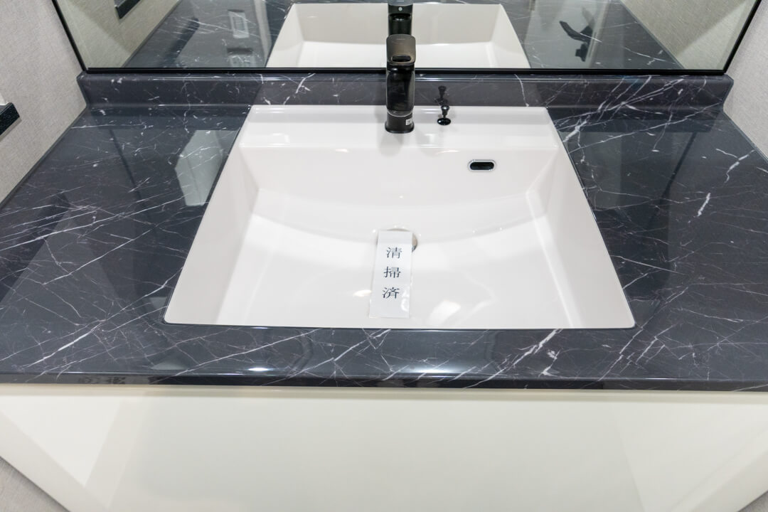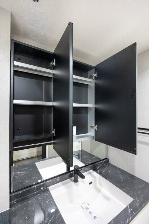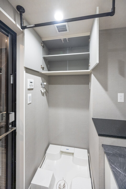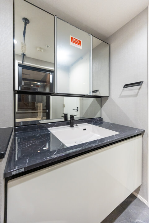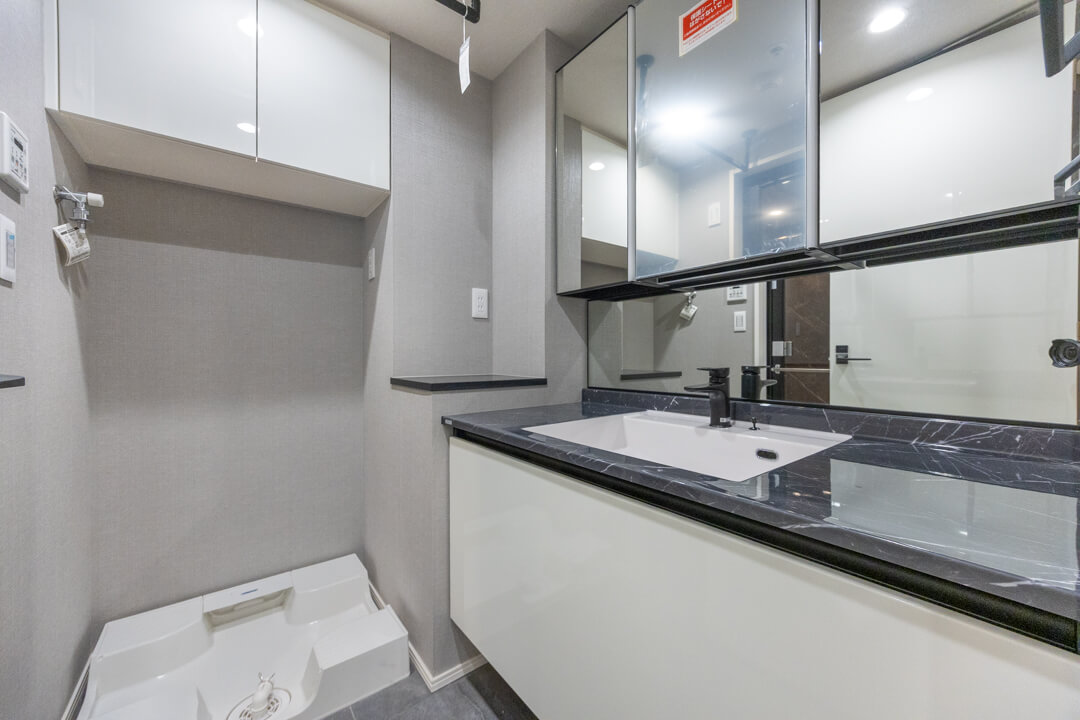 天然石調のカウンターでホテルライクな上質な雰囲気が漂う洗面化粧台。洗面まわりの小物がすっきり整頓できるミラーボックスや、モノの出し入れがしやすい引き出し式のキャビネットで使い勝手の良さもポイントです。洗濯機置き場の天井部分には室内干しにベンチな物干し金物も備わっています。