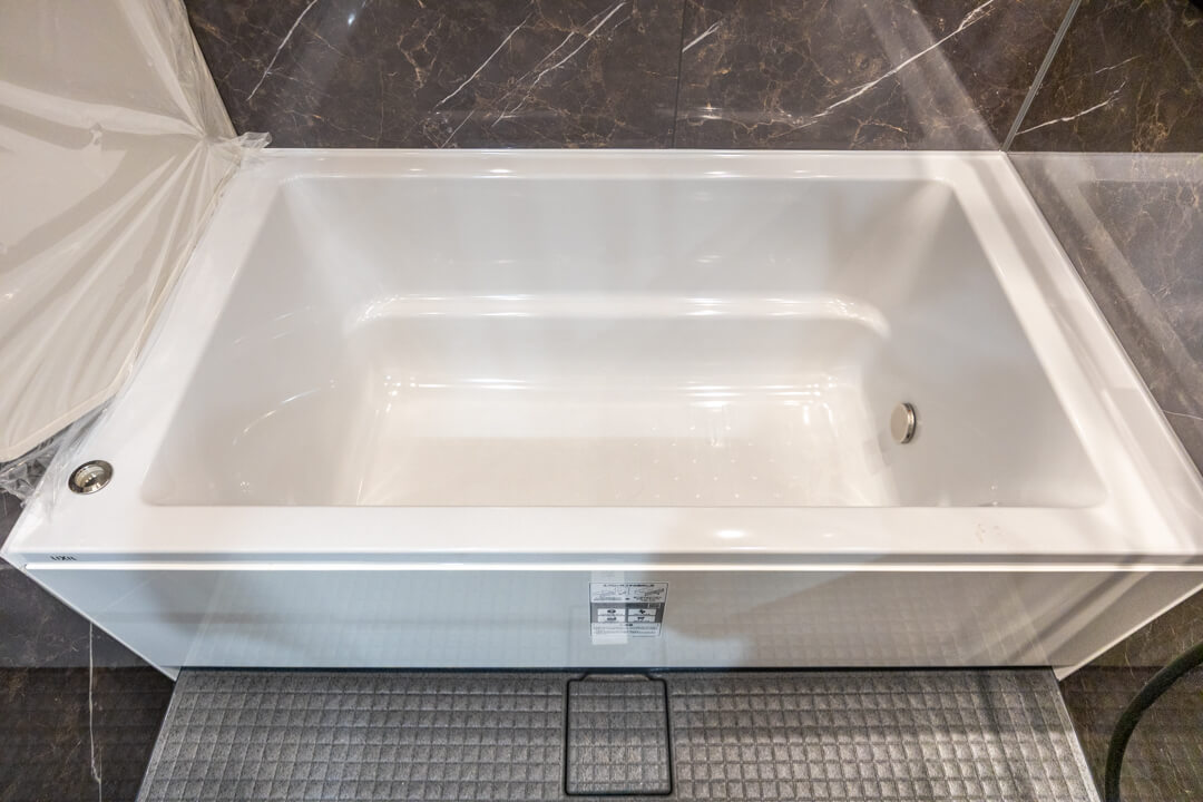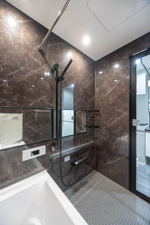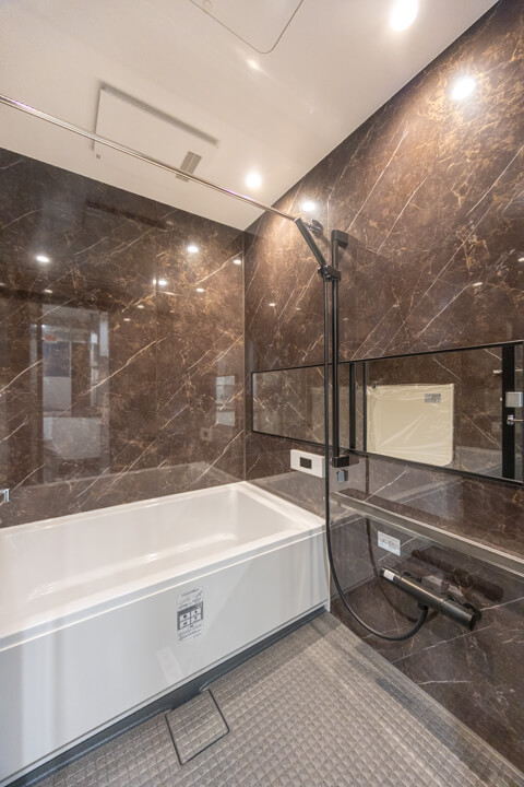 ストーン調の壁パエルで重厚感と上質な雰囲気漂うバスルーム。追い炊き機能の他、浴室換気乾燥機とランドリーパイプ付きで雨の日や冬場の洗濯にも困りません。