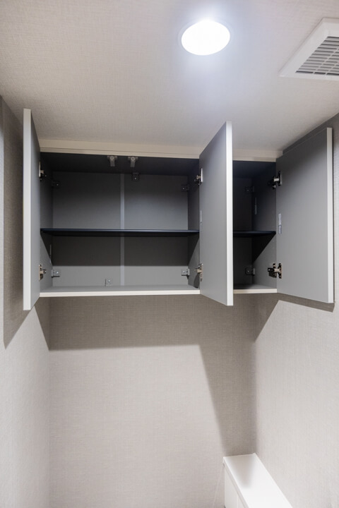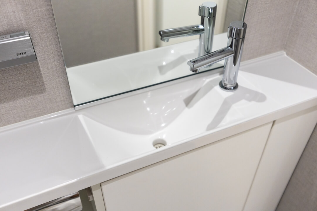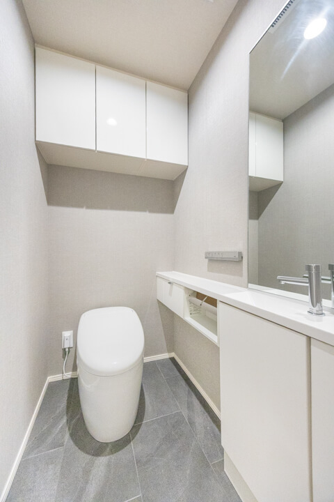 廊下に面したレストルーム。空間がすっきり見えるタンクレストイレを採用。独立型の手洗い器、ウォシュレット、収納スペースも備わっています。