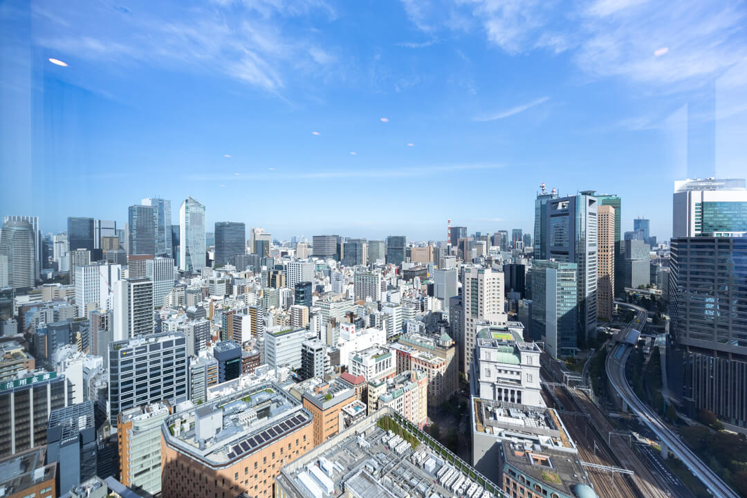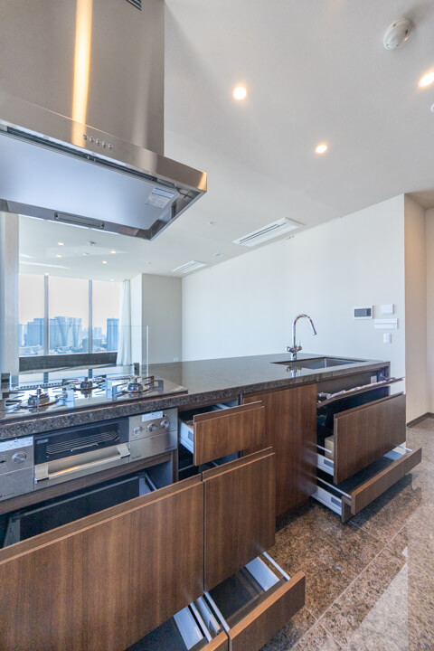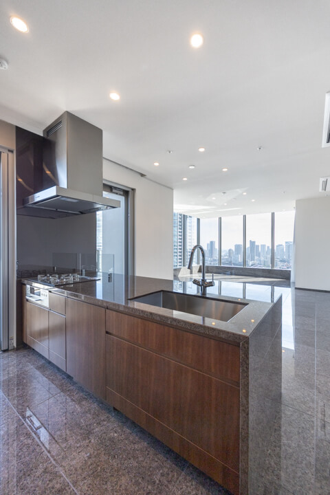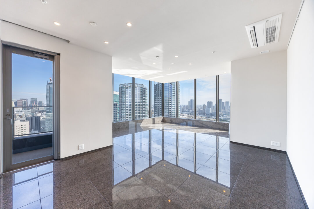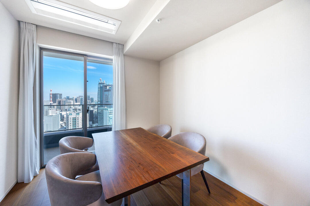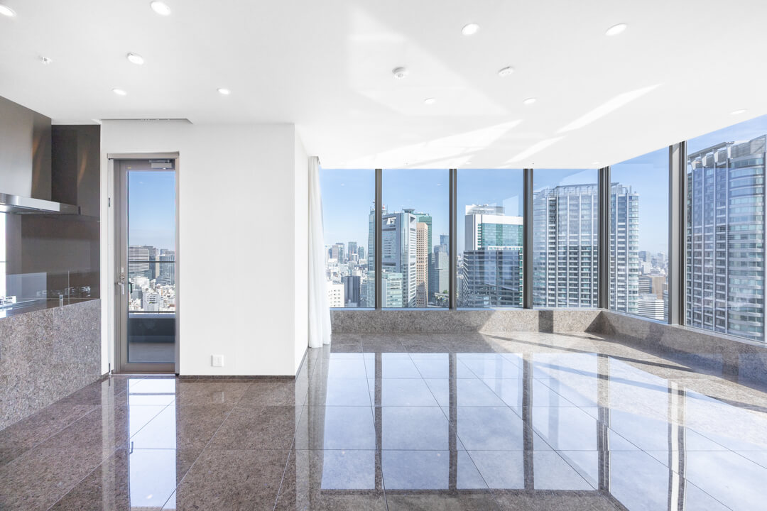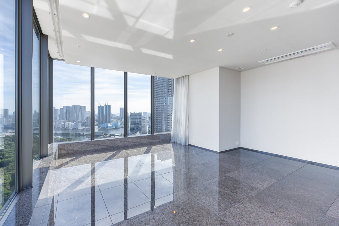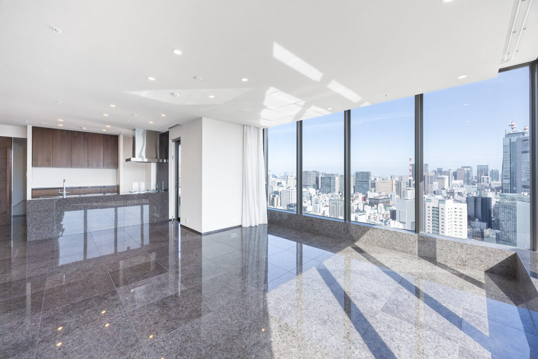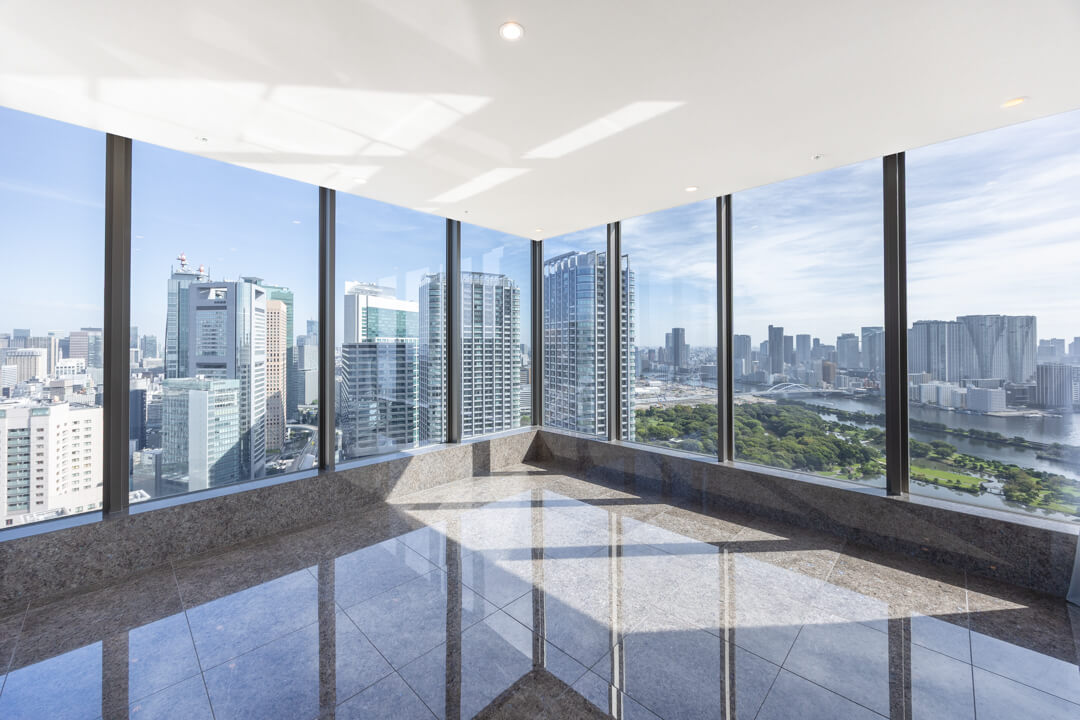 キッチンスペースを含め、約30.7帖のLDK。北東向きの二面採光で自然光が入る明るい空間。36階部のプレミアムフロアにつき、都心を見下ろせる開放的な景色と暮らせます。東の方角には浜離宮恩賜庭園の緑が望めます。