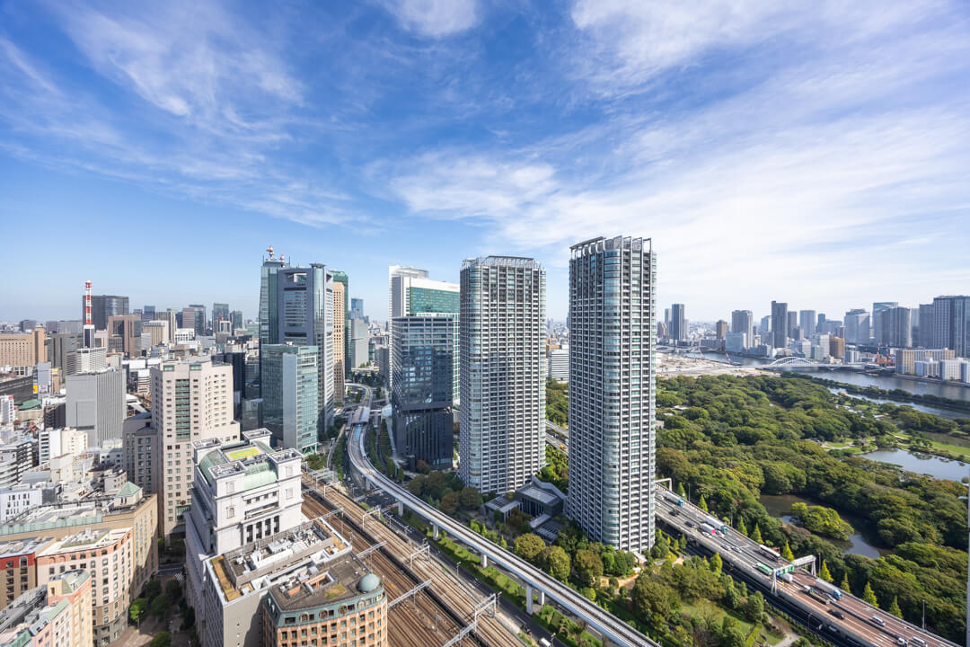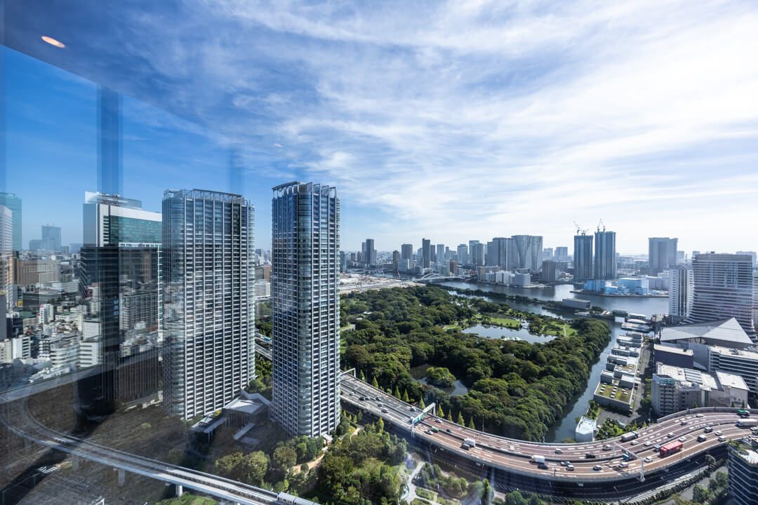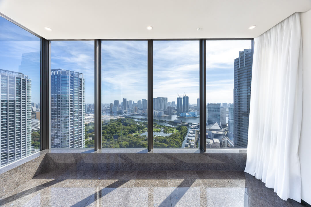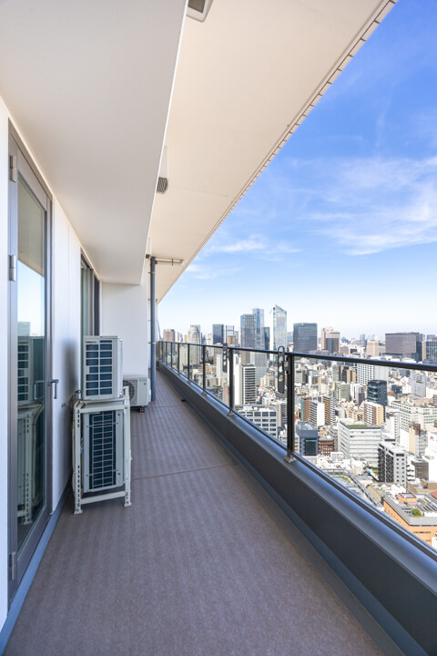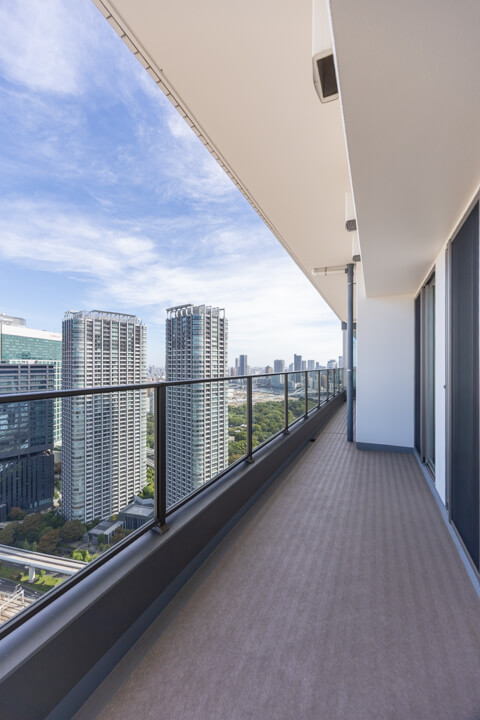 全居室に面したワイドスパンバルコニー。約27.80㎡のゆとりある広さです。バルコニー手すり部分が透明になっており、景色を遮らず開放感もUP。都心のビル群と浜離宮恩賜庭園の緑が望める開放的な景色が広がっています。