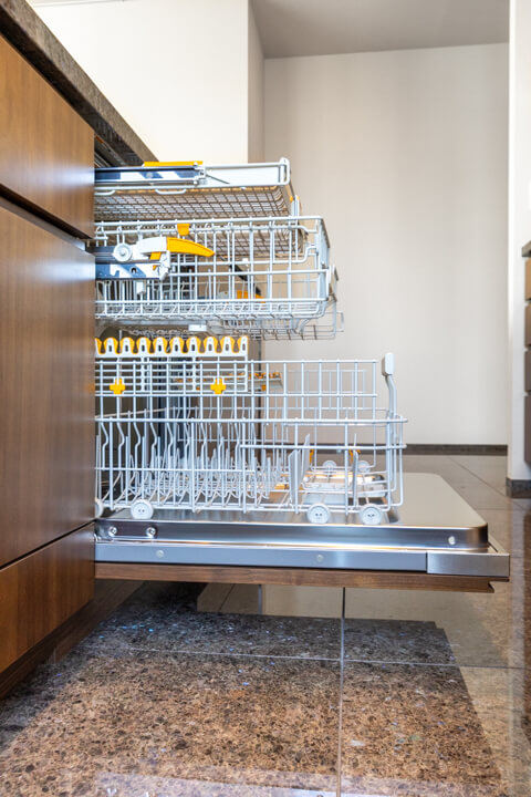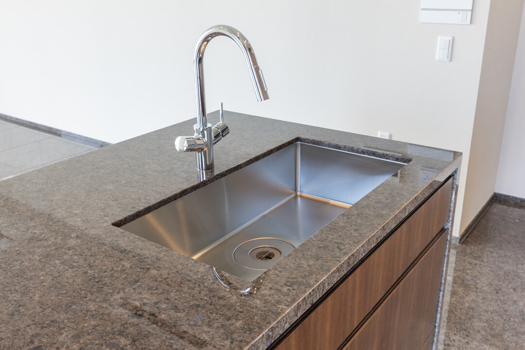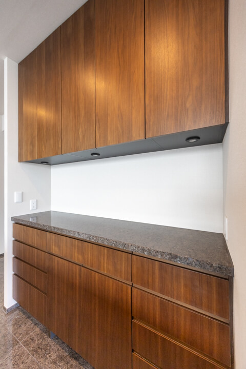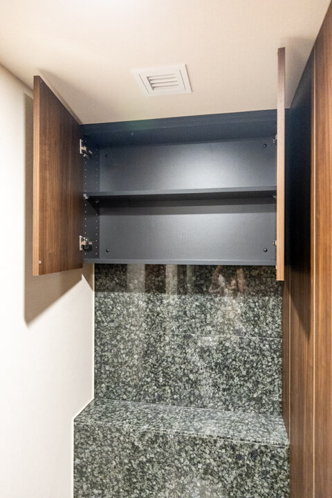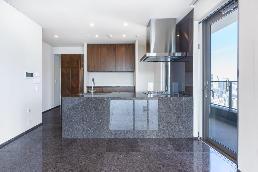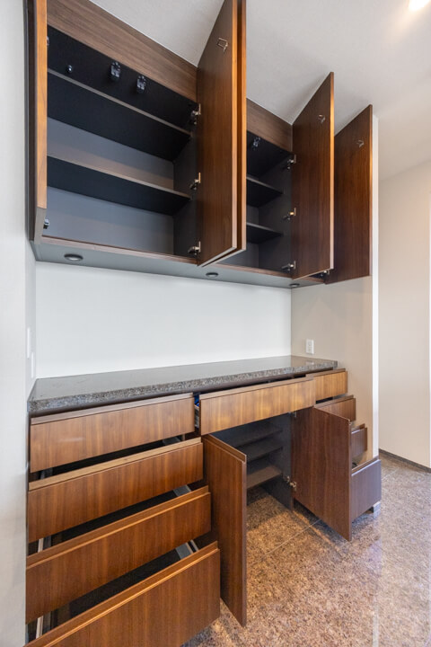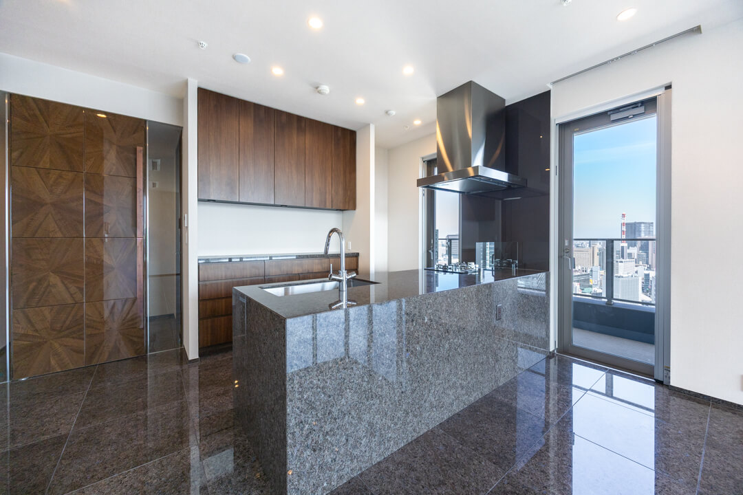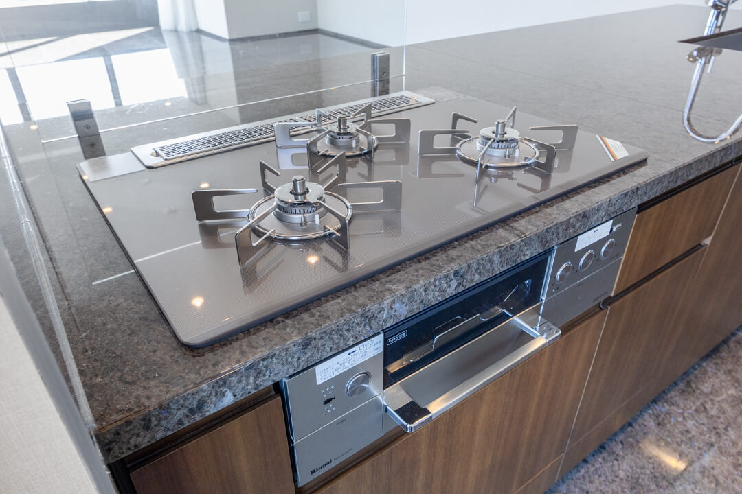 リビングダイニングを見渡せる開放的なオープンキッチン。床材と同様、天然石調のデザインで重厚感のある雰囲気です。家族やゲストと会話がしやすく、子どもの姿も見守れます。料理が捗る3口ガスコンロ、家事の時短に心強い大型の食洗機、生ごみの処理に便利なディスポーザー付きで設備も充実。カップボード付きで収納スペースもしっかりと確保されています。キッチン奥の勝手口からバルコニーへの出入りもできます。