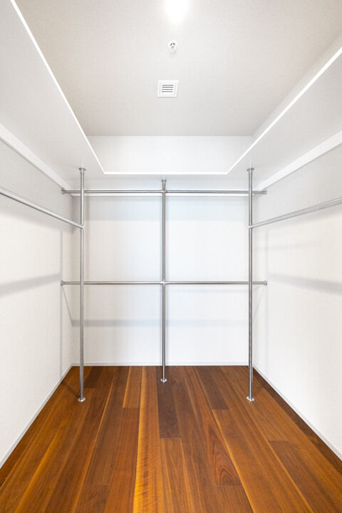 約9.3帖の主寝室。窓が大きく開放感たっぷり。ビルトインエアコンも備わっています。WIC(ウォークインクローゼット)は3方向にハンガーパイプが設置されていて、洋服がたくさん掛けられます。