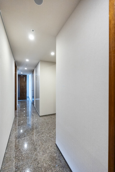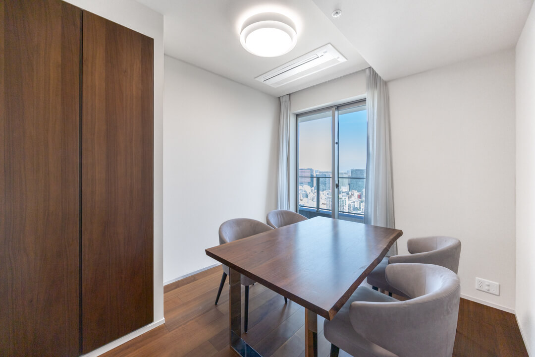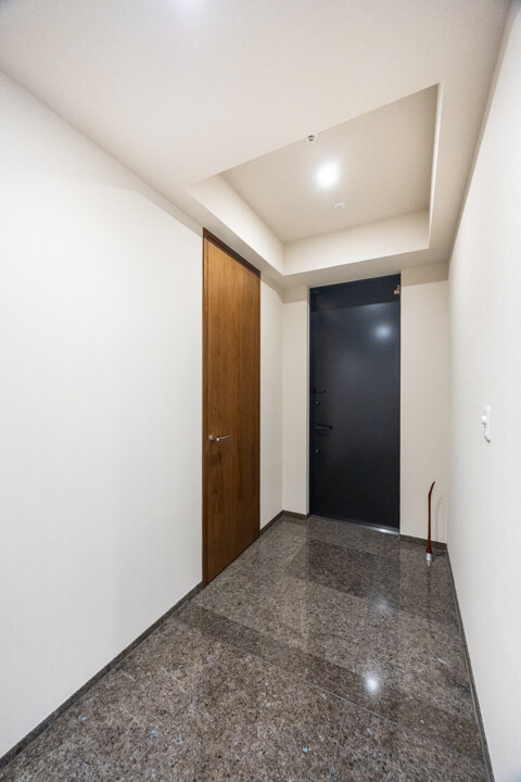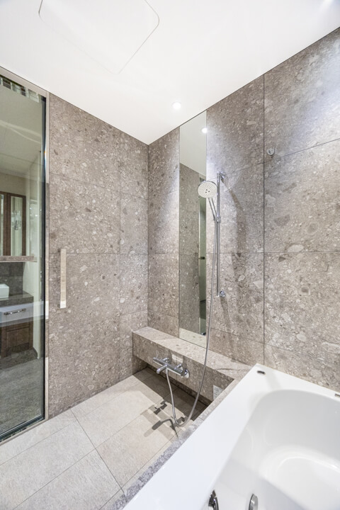 天然石調のタイル貼りでホテルライクな重厚感と上質な雰囲気が感じられます。ビルトインエアコンも2基設置されていて、室内の温度調整もスムーズ。また、バルコニーへの出入りも可能です。