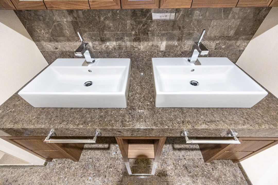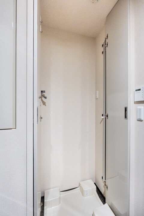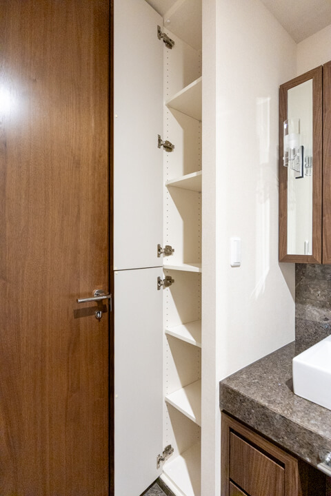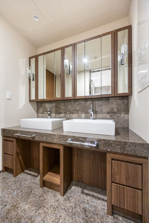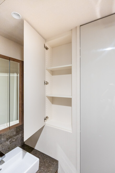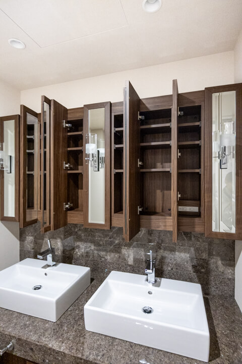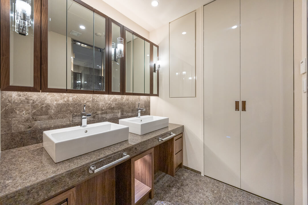 高級ホテルのような重厚感のあるデザインが印象的な洗面化粧台。2ボウル仕様で家族で使用時間が重なってもそれぞれゆっくり使えます。洗面まわりの小物がすっきり整頓できるミラーボックス付き。洗濯機置き場は扉付きで生活感を目隠しできます。さらに扉は収納可能なので普段は扉を開けた状態で使うこともできます。