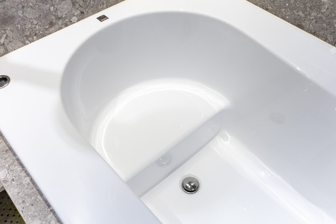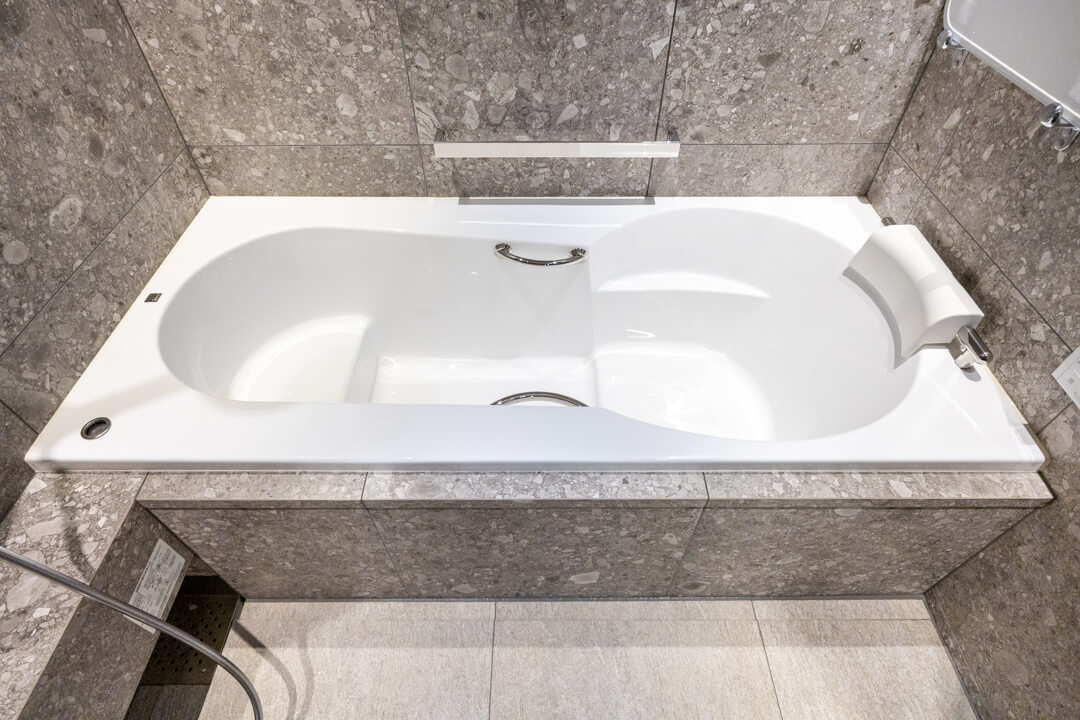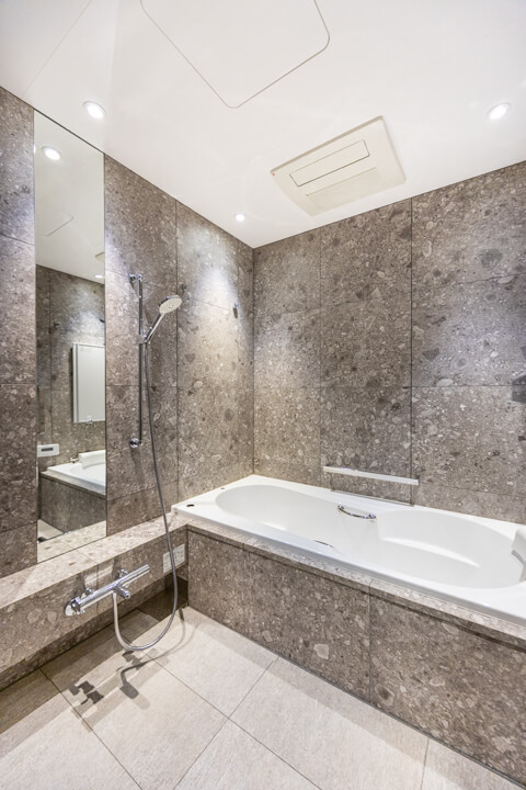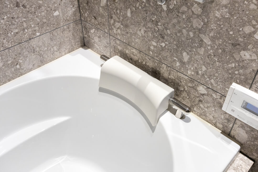 1820サイズのゆとりある広さのバスルーム。天然石調のデザインで重厚感と上品な雰囲気。追い炊き機能の他、乾燥・換気・暖房・涼風の4つの機能備わっており、一年中快適にバスタイムが楽しめます。全身浴はもちろん、浴槽ステップ付きなので半身浴もしやすい形状。ヘッドレスト付きでゆったりと湯船で寛げます。