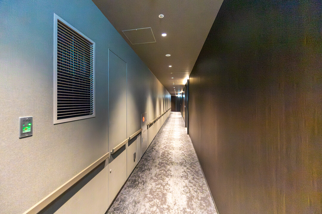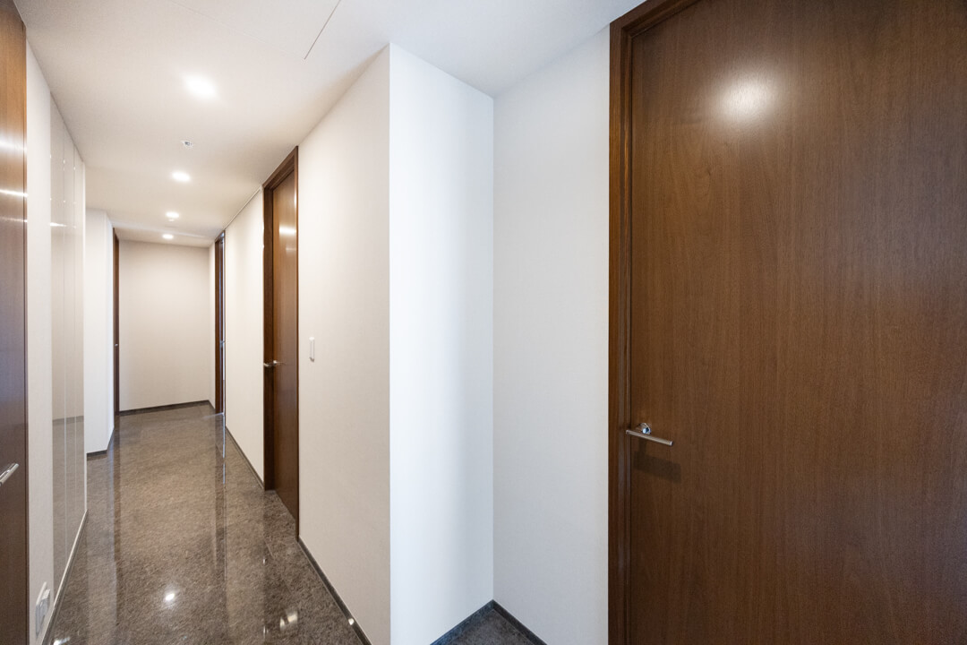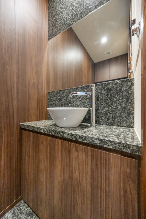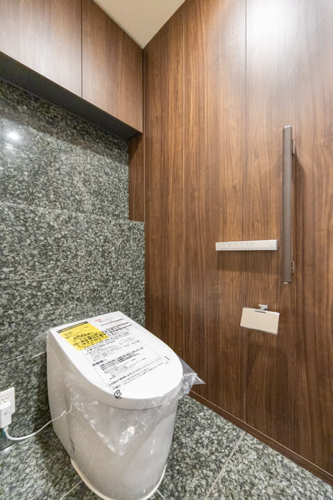 廊下に面したレストルーム。空間がすっきり見えるタンクレストイレです。独立型の手洗いカウンター、ウォシュレット、収納スペースも備わっています。
