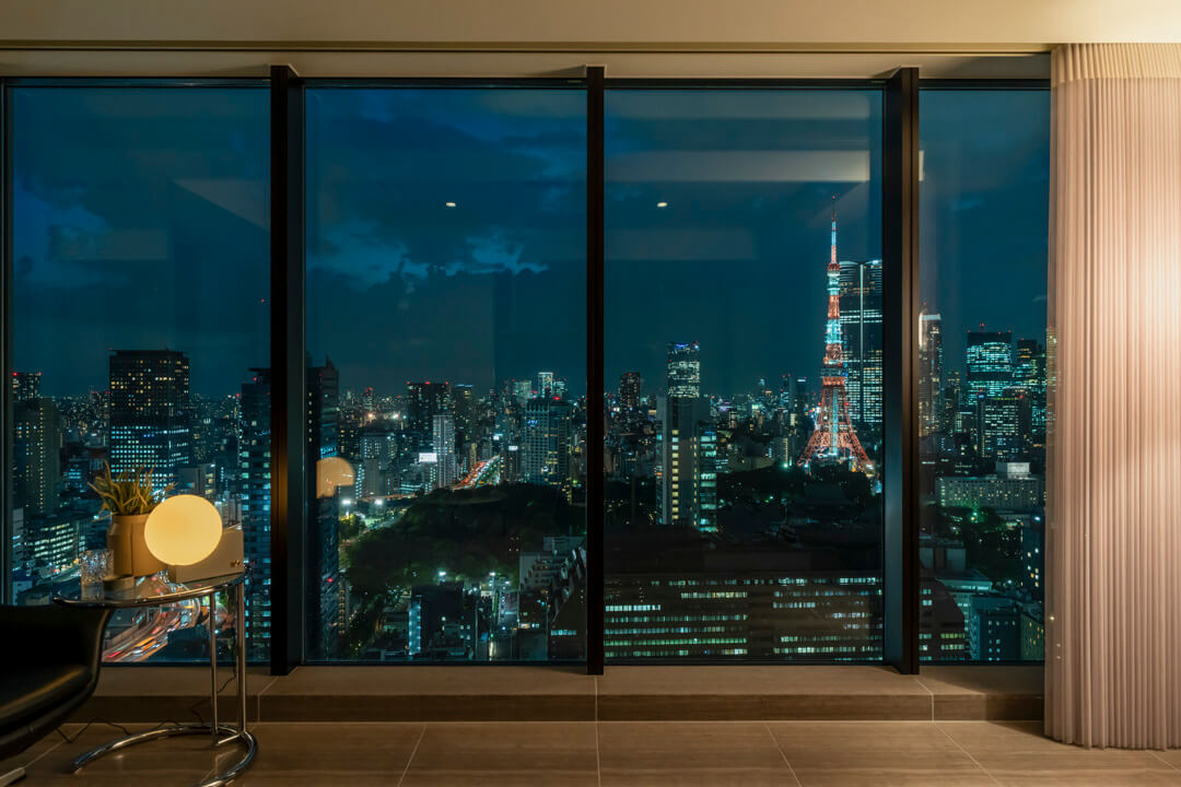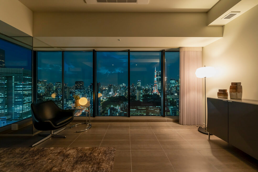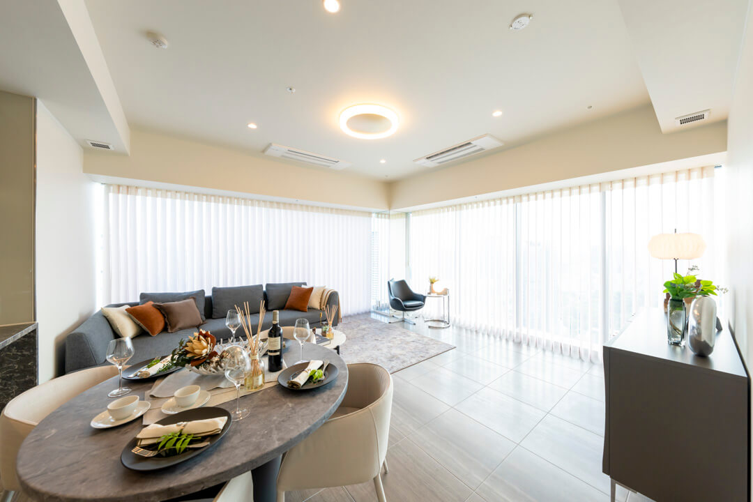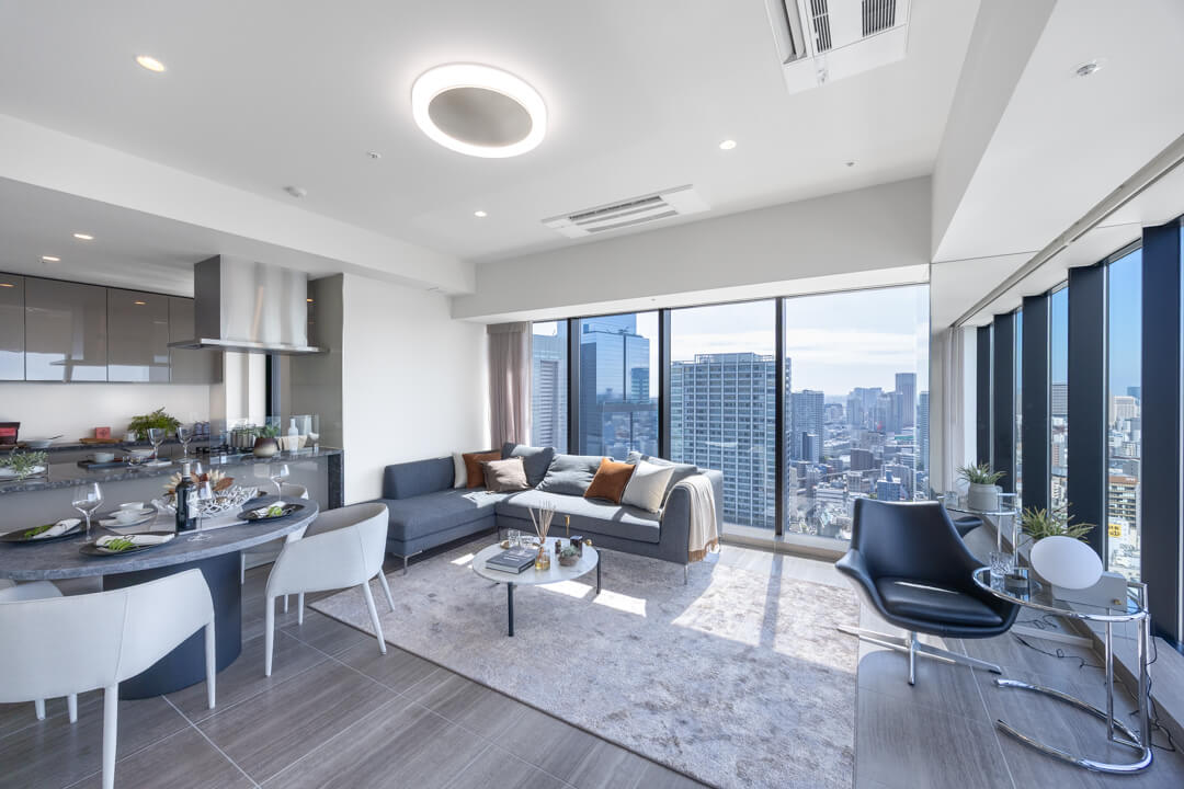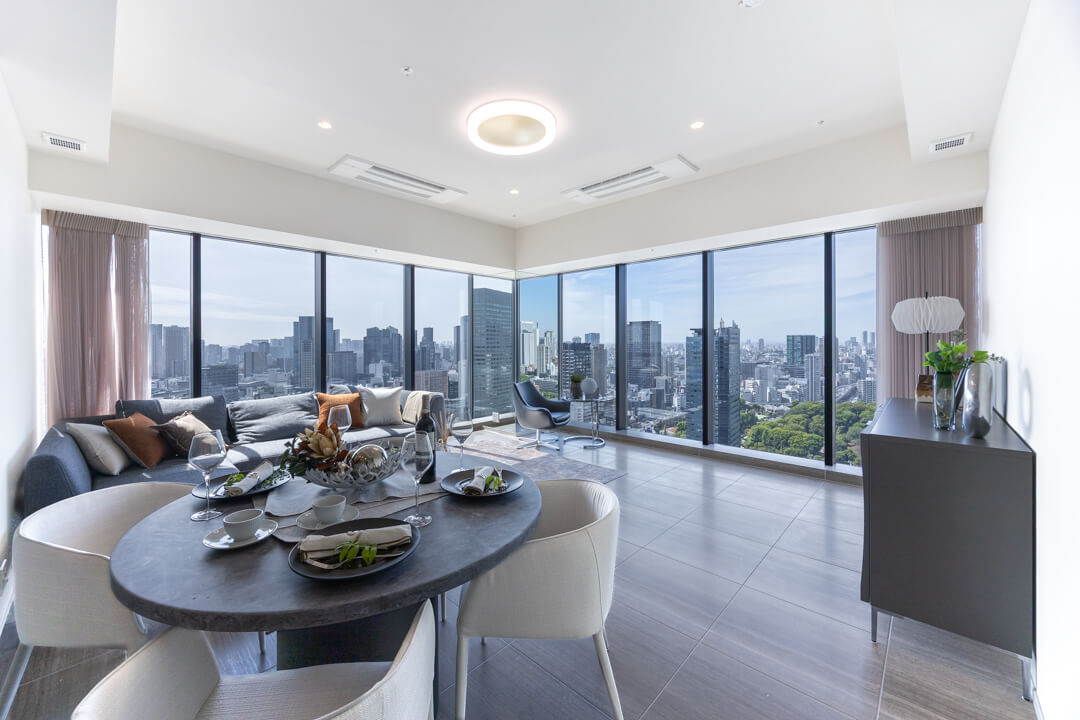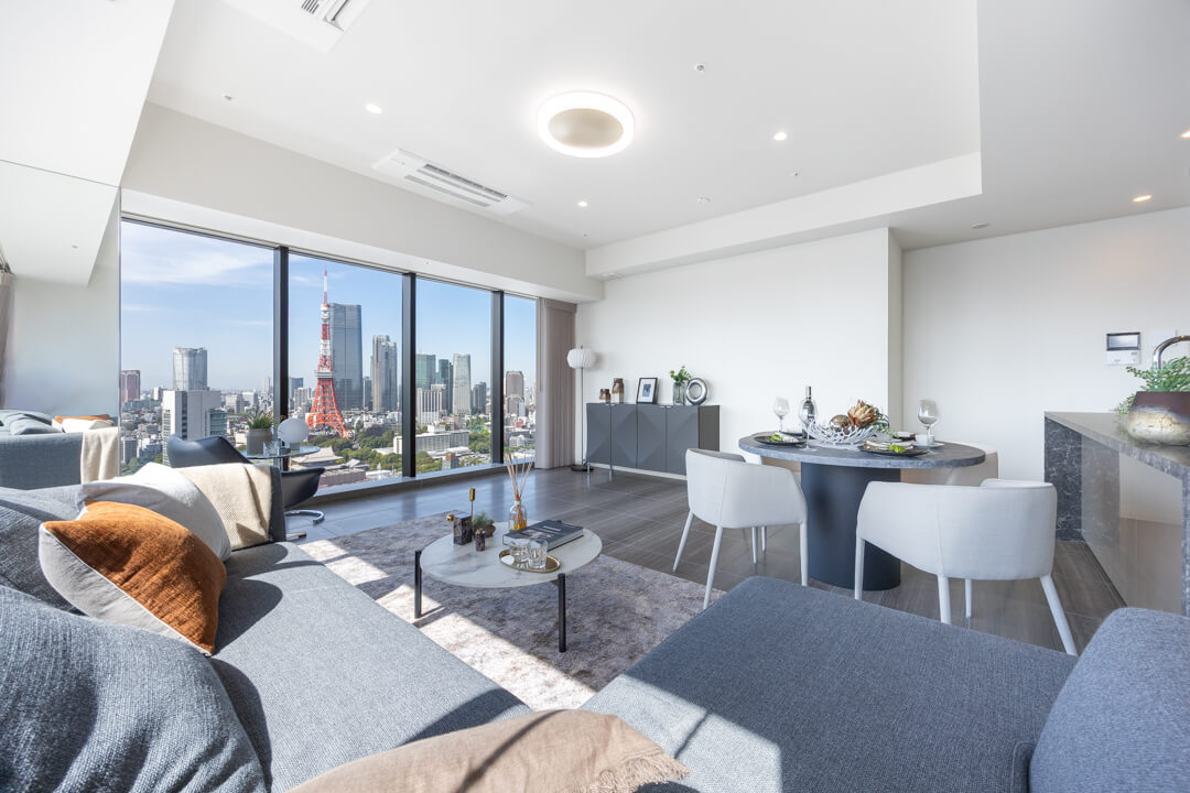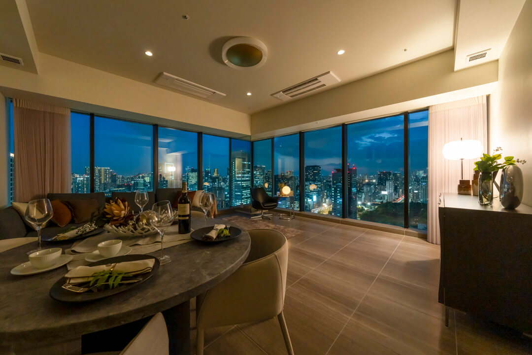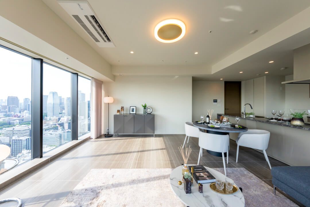 約19.3帖のリビングダイニング。家族でゆったりと過ごせ、ゲストを招いて食事会などもできる広さです。南西向きに広がるパノラマビュー。30階部の高層階につき、開放的な景色と暮らせます。西の方角には東京タワーも望むこともでき、夜には夜景も楽しめます。また、窓際の柱にはミラーが施されており、景色が反射してより開放感のある印象に◎。