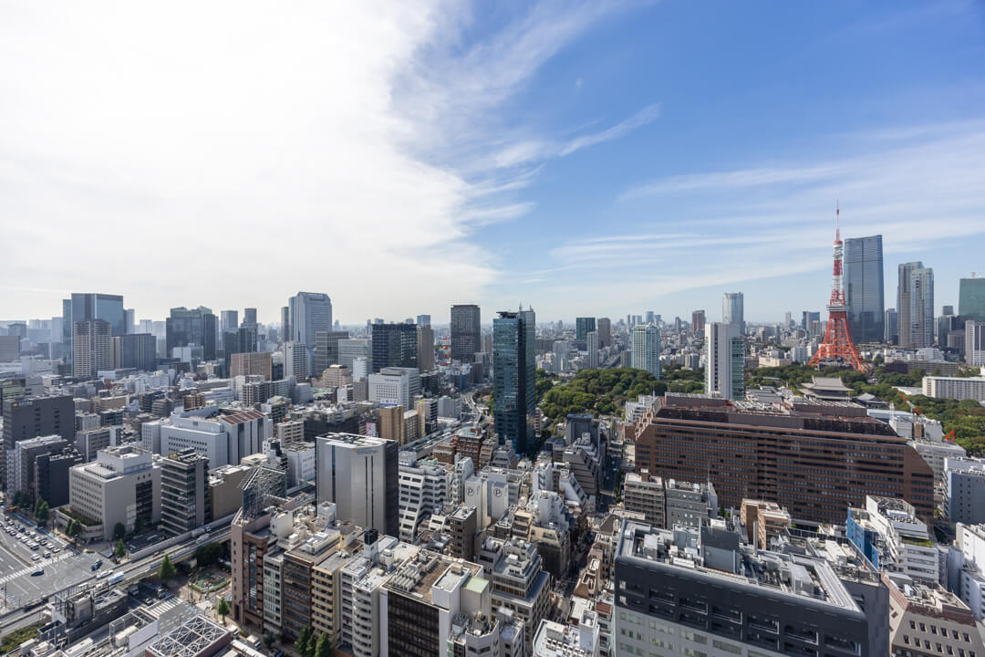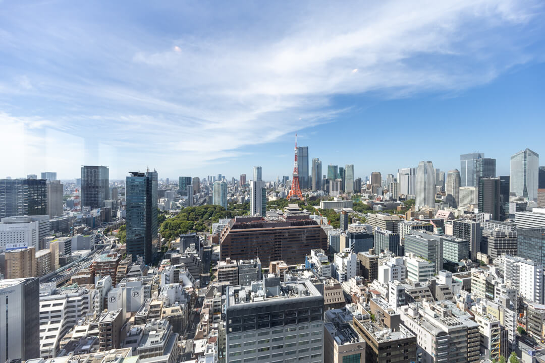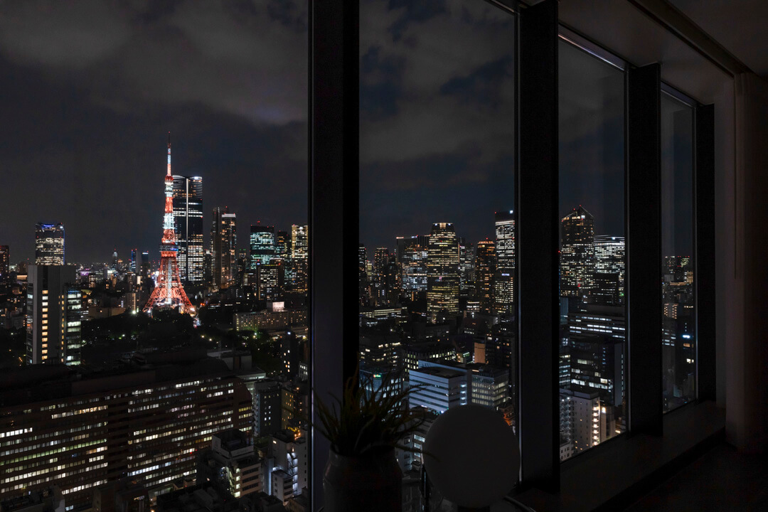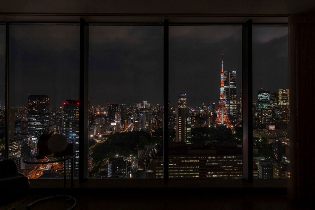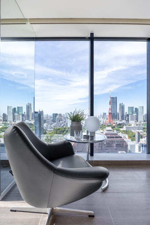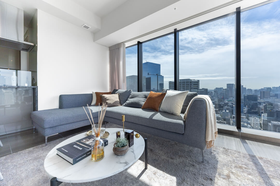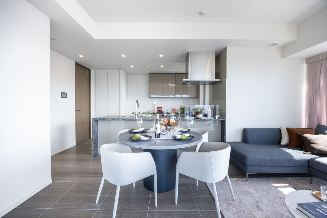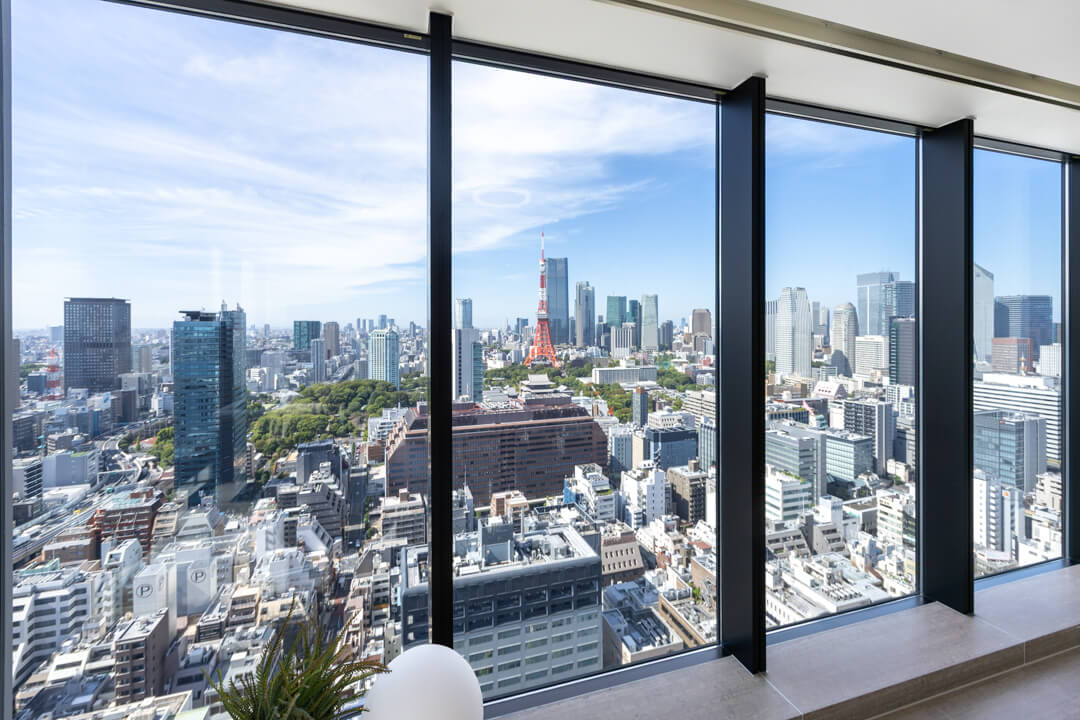 約19.3帖のリビングダイニング。家族でゆったりと過ごせ、ゲストを招いて食事会などもできる広さです。南西向きに広がるパノラマビュー。30階部の高層階につき、開放的な景色と暮らせます。西の方角には東京タワーも望むこともでき、夜には夜景も楽しめます。また、窓際の柱にはミラーが施されており、景色が反射してより開放感のある印象に◎。