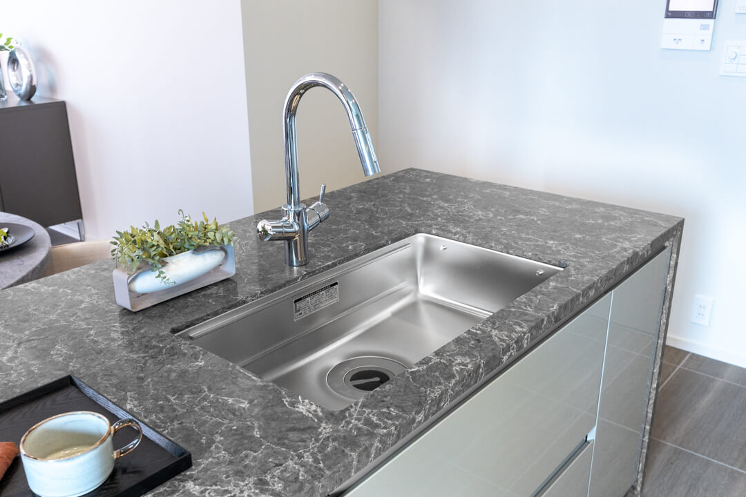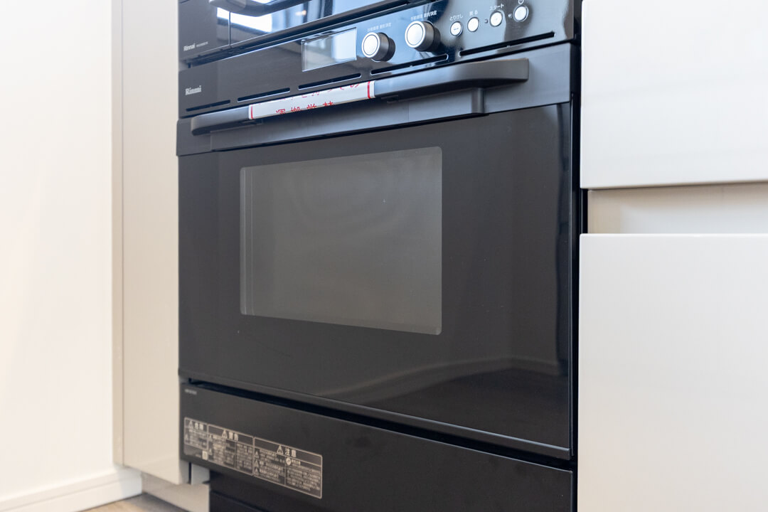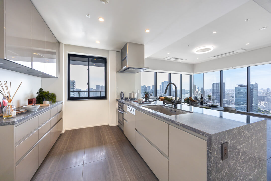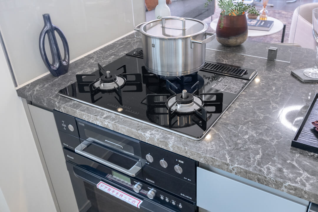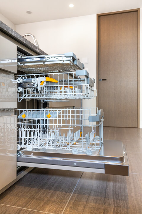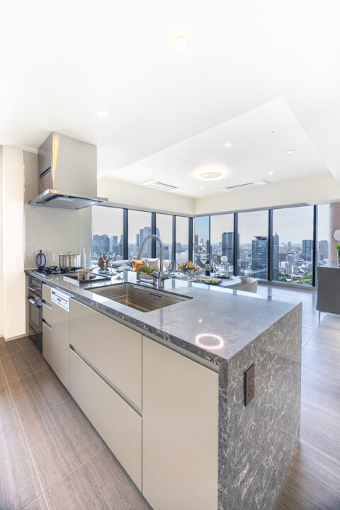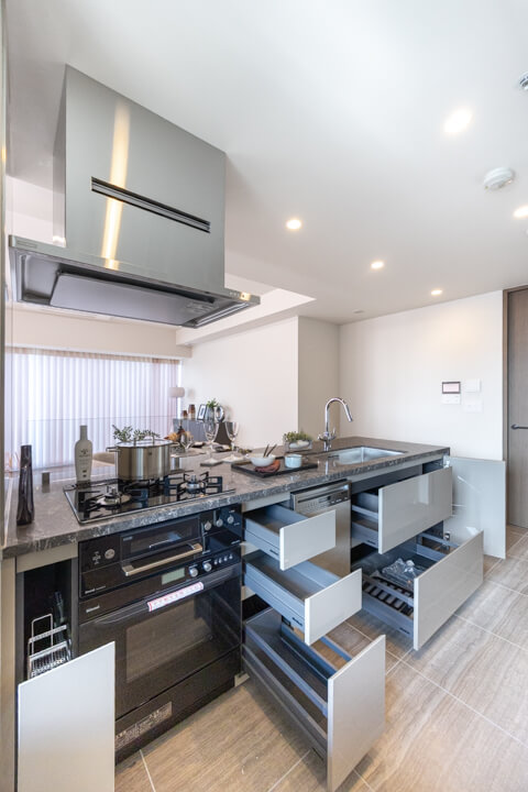 リビングダイニングを見渡せる開放的なオープンキッチン。家族やゲストと会話がしやすく、小さなお子さんがいるご家庭では子どもの姿も見守れます。料理が捗る3口ガスコンロ・ビルトインオーブン、家事の時短に心強い大型食洗機、生ごみの処理に便利なディスポーザー付きで設備も充実しています。