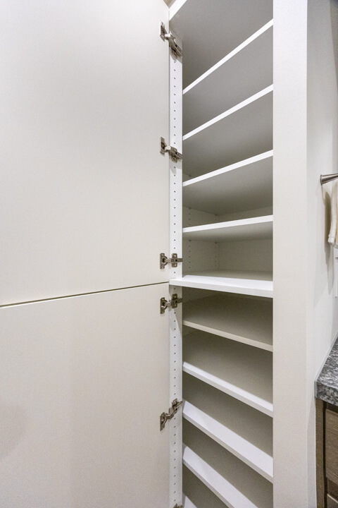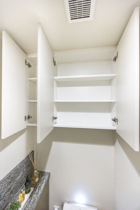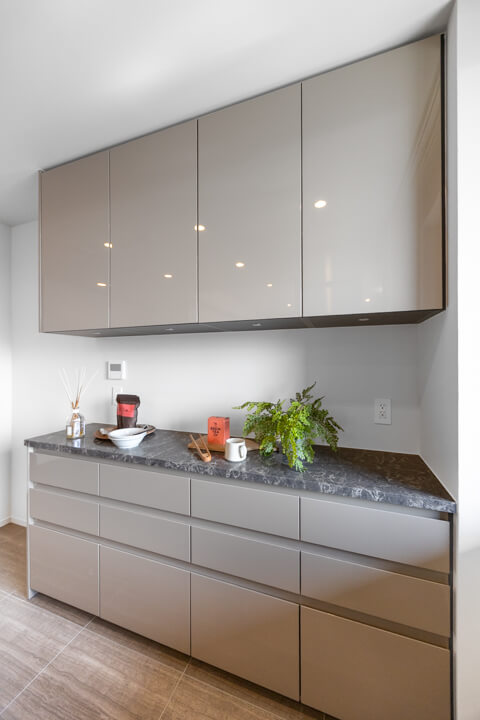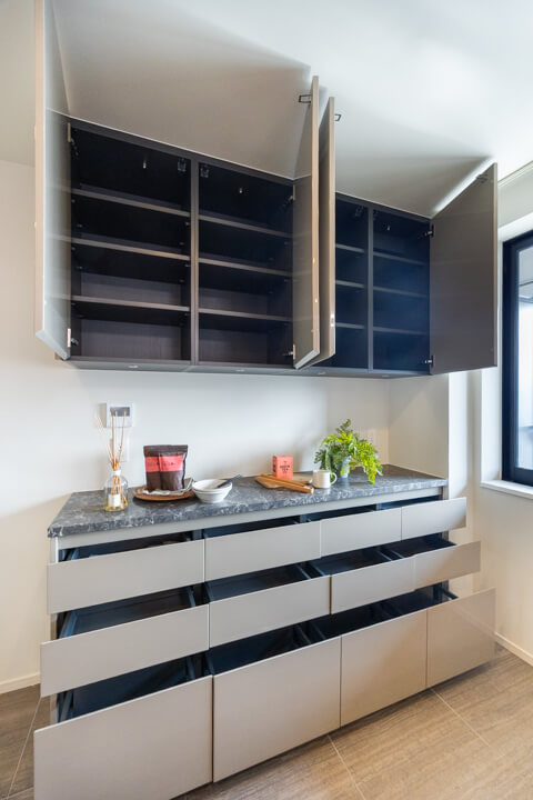 キッチン下のキャビネットはモノの出し入れがしやすい引き出し式で使い勝手の良さもポイント。カップボードも備わっており、収納スペースもしっかり確保されています。また、別途収納庫も設置されていて、食品ストックやキッチン雑貨の整頓に便利です。