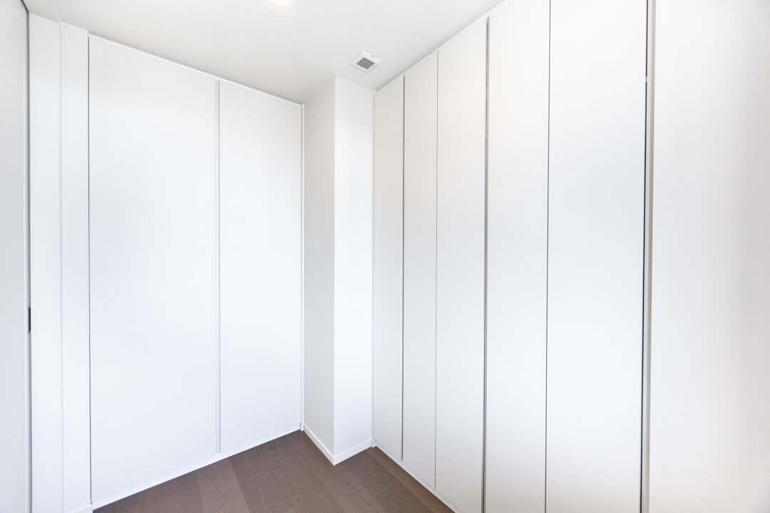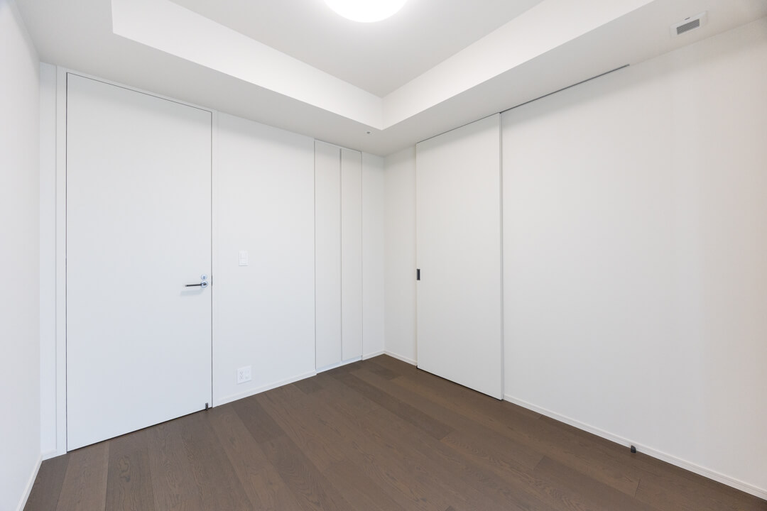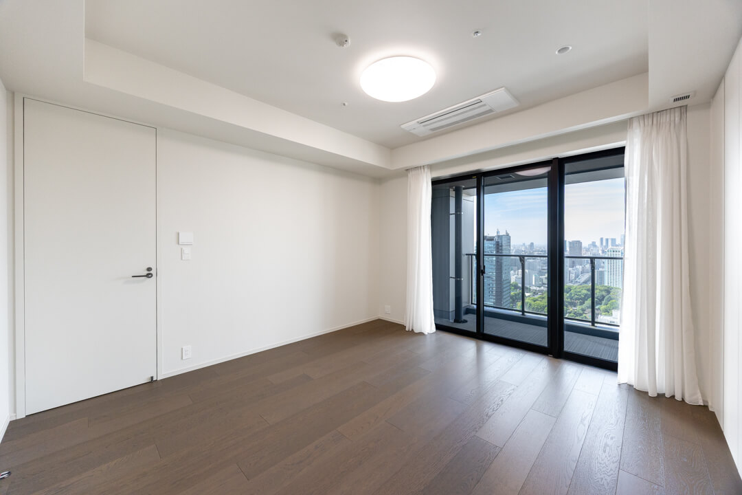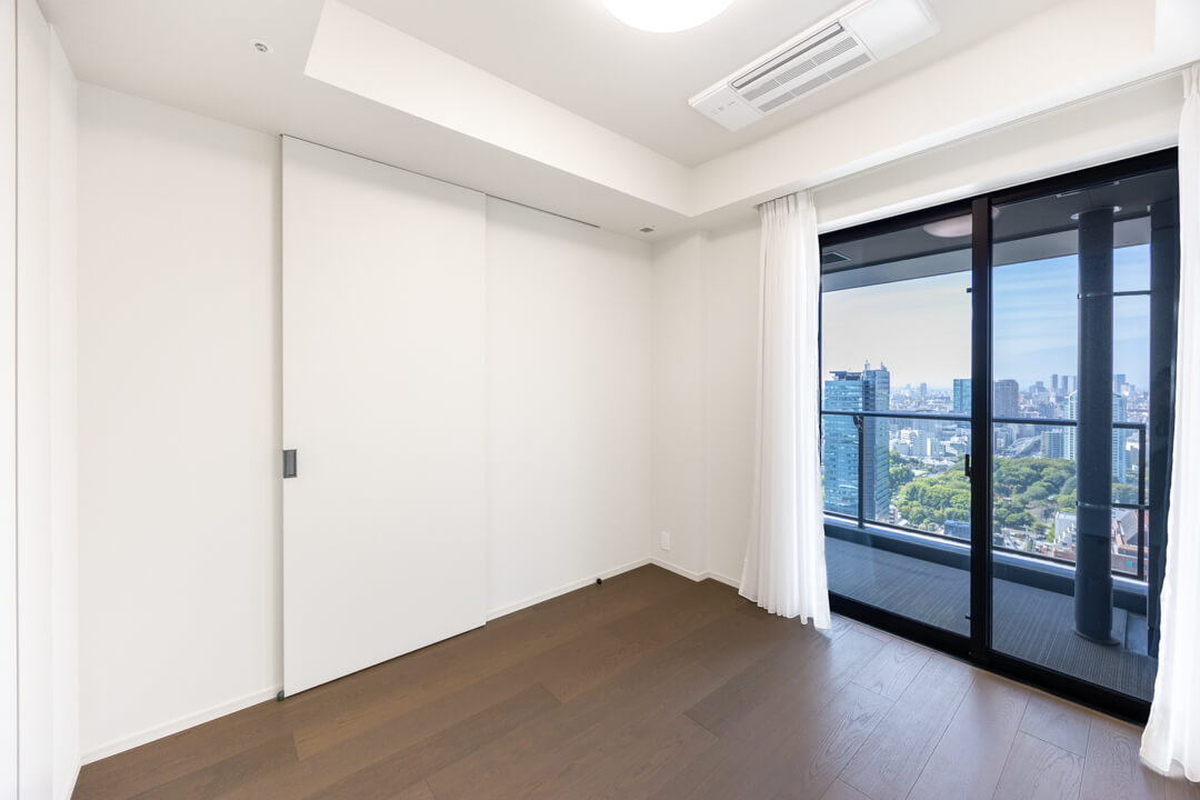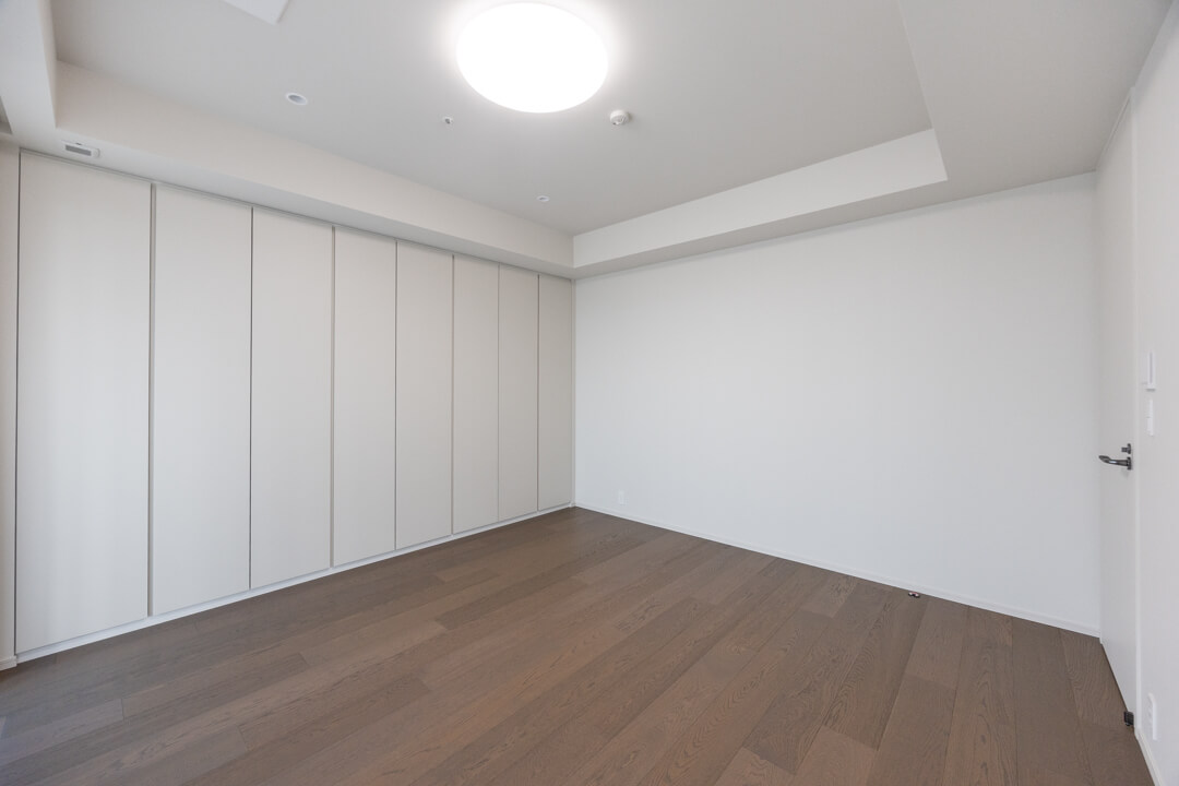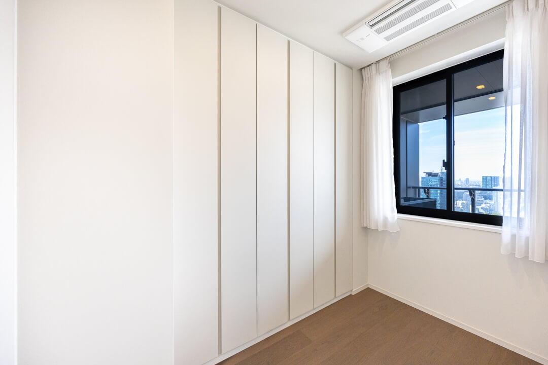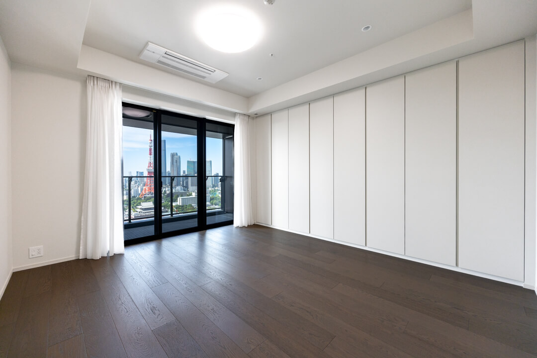 約9.9帖の主寝室。大きな窓で室内からも眺望良好。バルコニーへの出入りもできます。壁一面にクローゼットが並んでおり、収納スペースも充実しています。