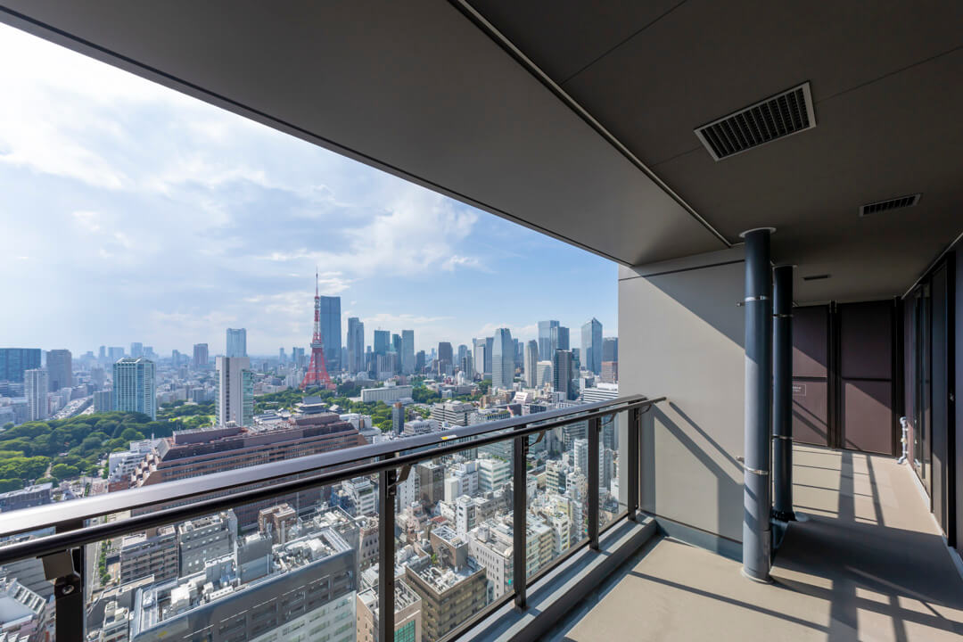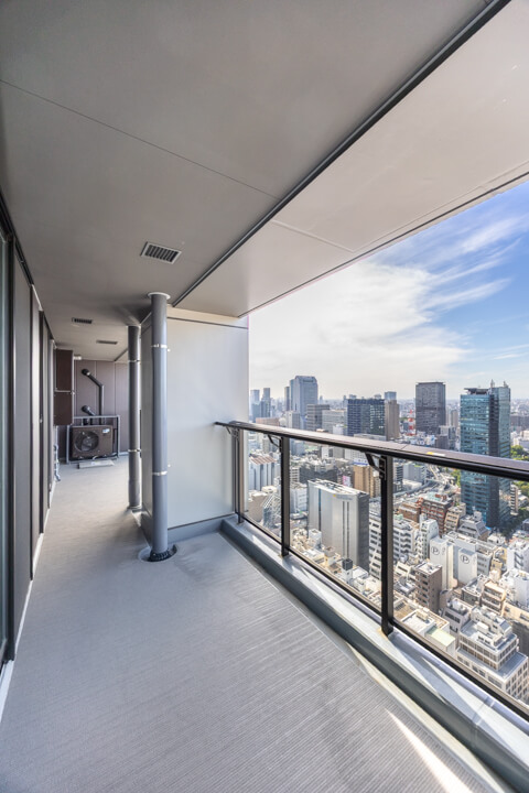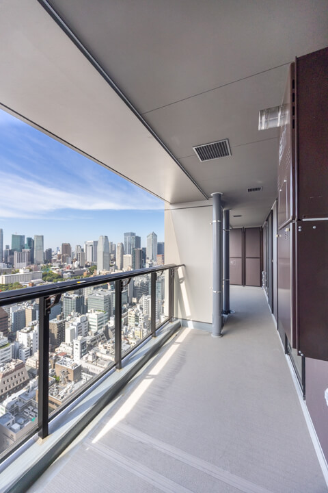 洋室に面した西向きのバルコニー。約17.71㎡ほどのゆとりある広さです。手すりが透明で景色を遮らず開放感もUP。30階部の高層階につき、開放的な景色が望めます。西の方角には東京タワーも望め、夜には夜景も楽しめます。