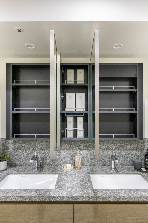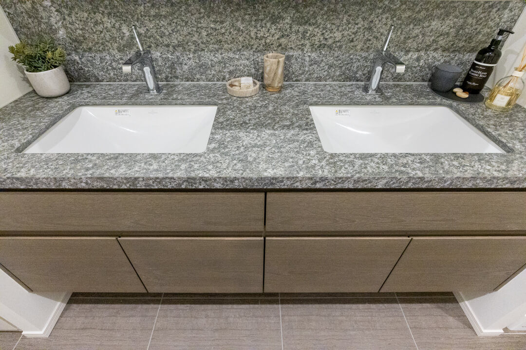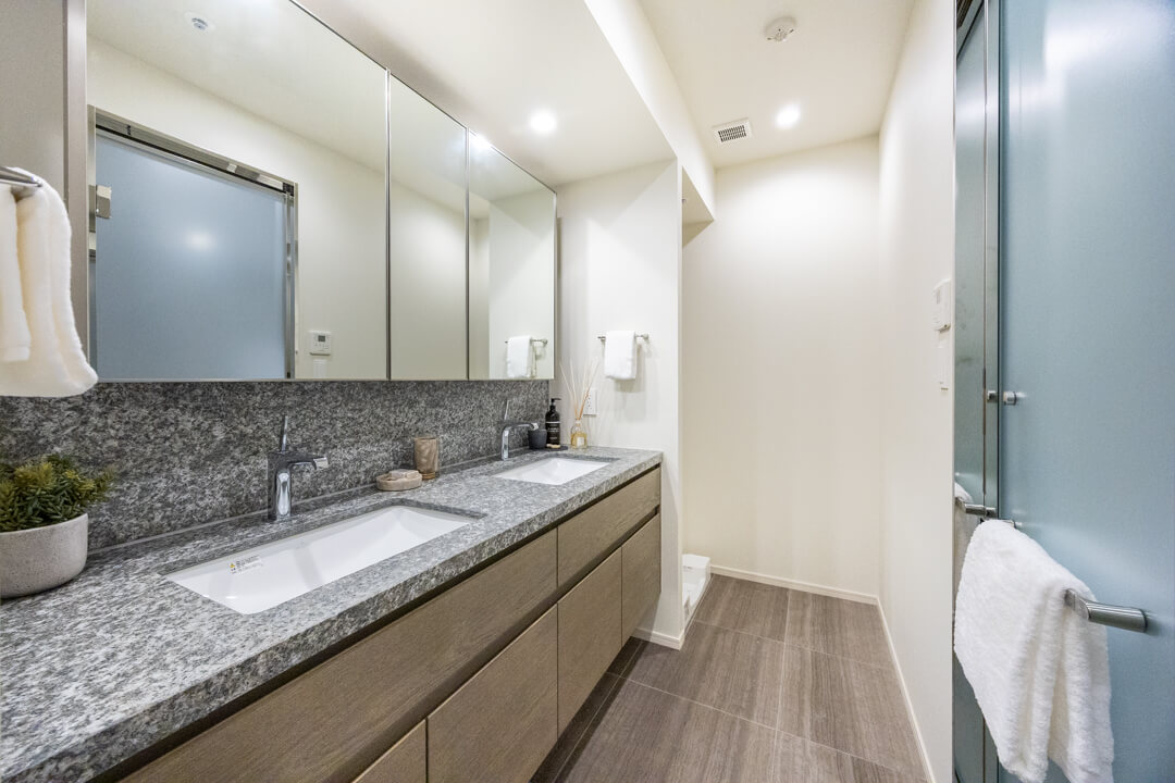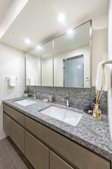 ホテルライクな2ボウルの洗面化粧台。家族で使用時間が重なってもそれぞれゆっくり使えます。洗面まわりの小物がすっきり整頓できるミラーボックスや、モノの出し入れがしやすい引き出し式のキャビネットで使い勝手の良さもポイント。別途リネン庫も備わっています。