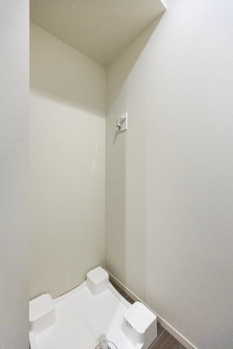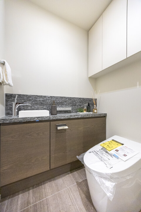 廊下に面したレストルーム。空間がすっきり見えるタンクレストイレです。独立型の手洗い器、収納スペースも完備。ウォシュレットリモコンはスティック型でスタイリッシュな雰囲気です。