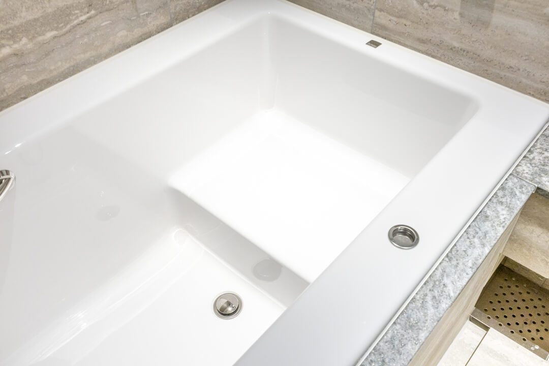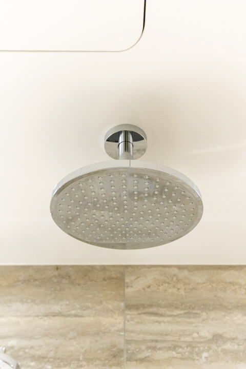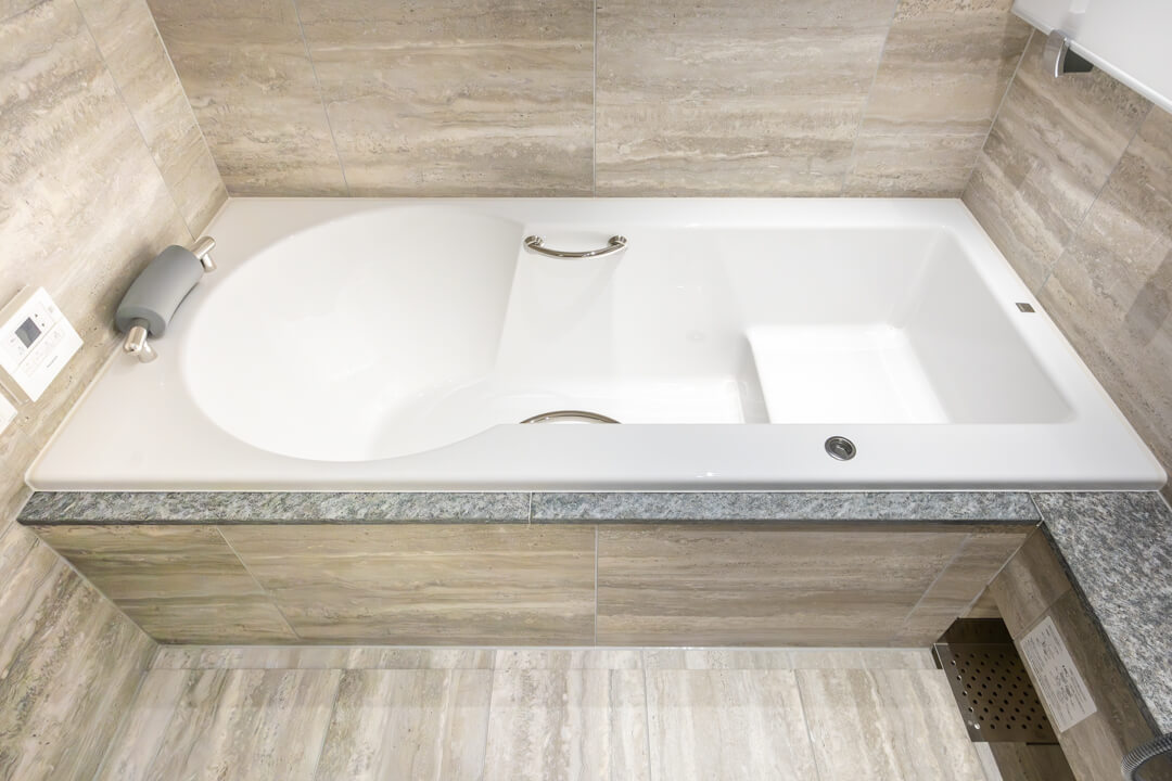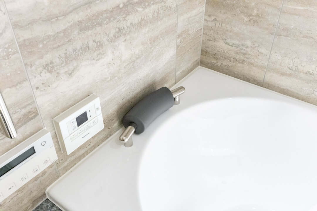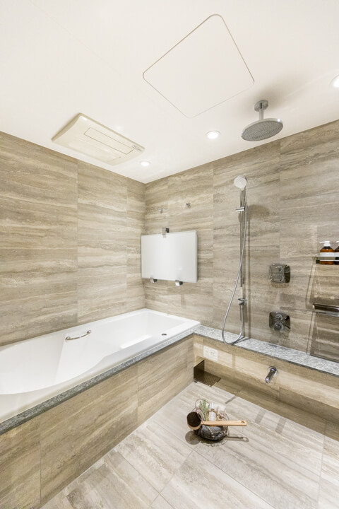 1820サイズのゆとりある広さのバスルーム。石目調でホテルライクな重厚感と上質な雰囲気が感じられます。追い炊き機能の他、ミストサウナ・換気・暖房・換気の機能が備わっており、一年中快適にバスタイムが楽しめます。身体全身をやさしく包み込んでくれるオーバーヘッドシャワーも設置されています。また、浴槽にはヘッドレストが付いていて、よりリラックしながら湯船で寛げます。