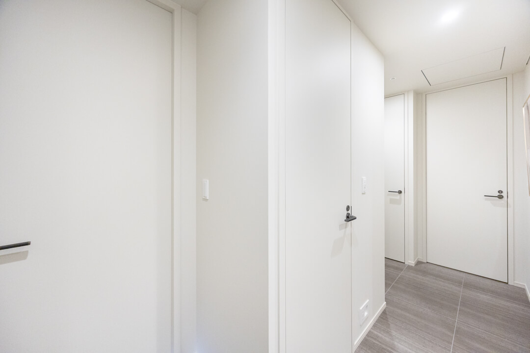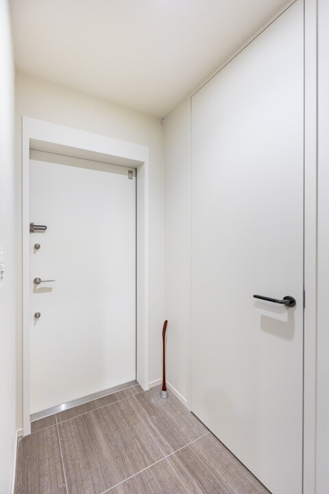 SIC(シューズインクローゼット)付きで靴がたっぷりと収納可能。可動棚なのでブーツなど高さのある靴もすっきりと整頓できます。また、廊下にも収納スペース、玄関外には専用使用権付きのトランクルームが備わっています。