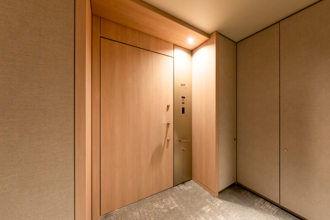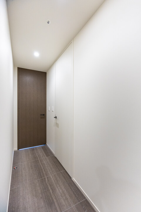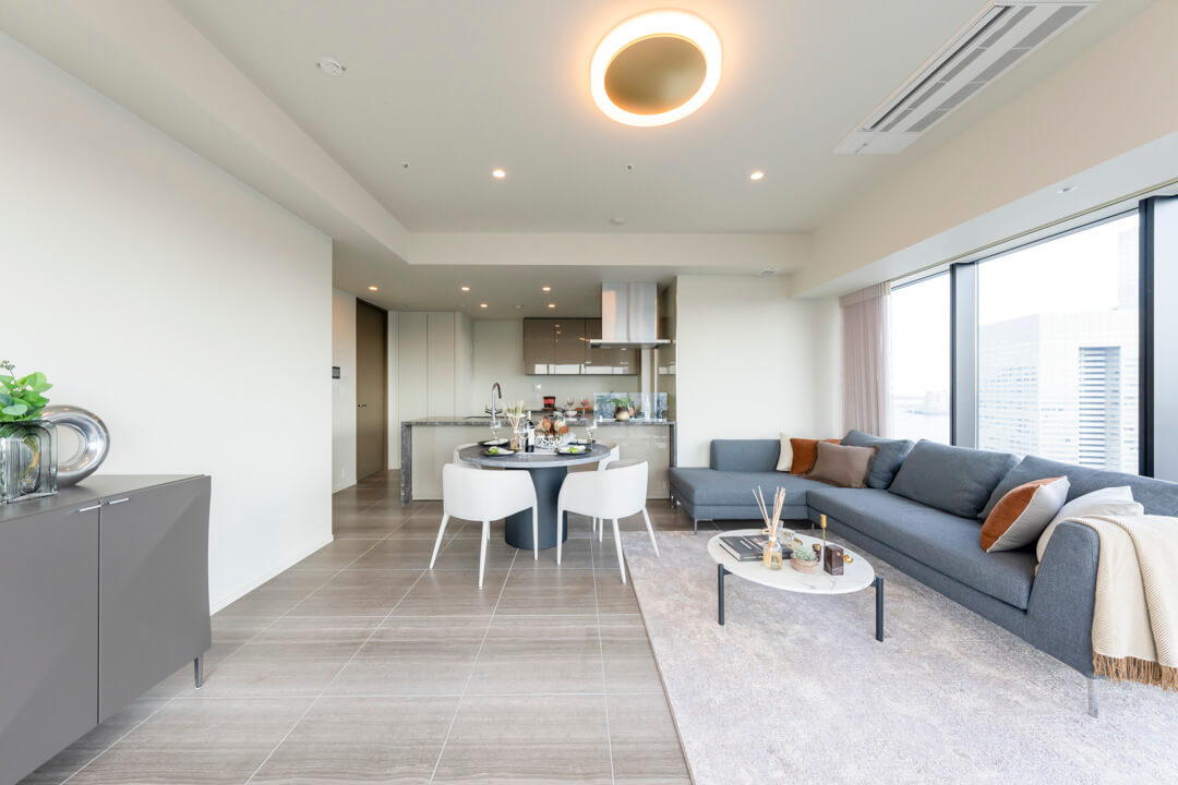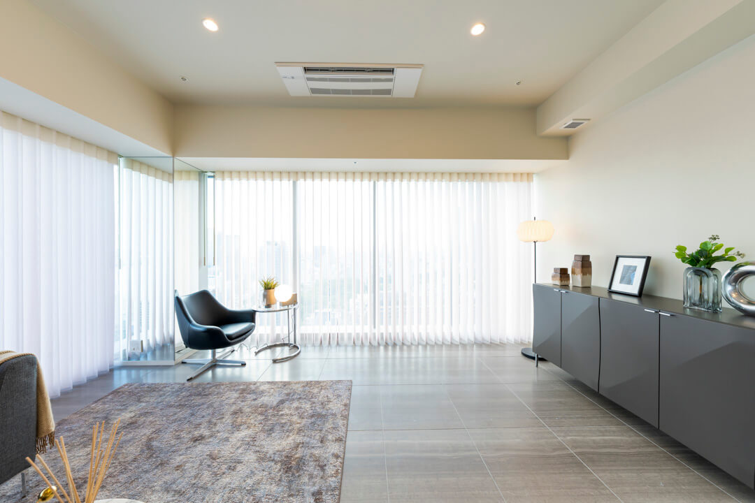 床はホテルライクなタイル貼りで上質な雰囲気。床暖房が設置されており、冬場でも足元からじんわりと温まれます。また、ビルトインエアコンが2基備わっていて室内の温度調整もスムーズです。