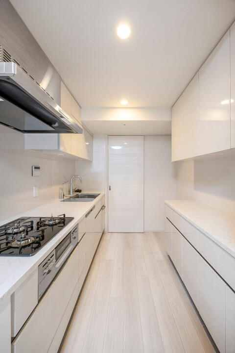 キッチンは、生活感が出やすいキッチンまわりをさりげなく目隠しすることができる独立キッチンです。リビングダイニングからだけでなく、廊下からも出入りができる便利な動線にもなっています。