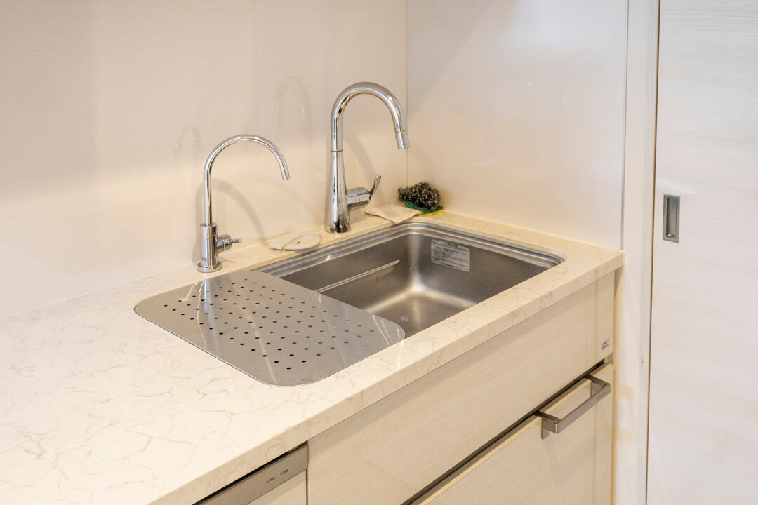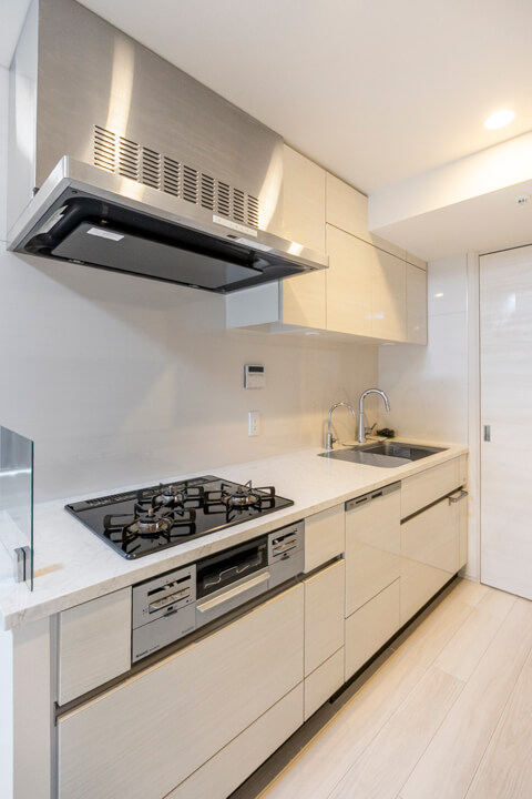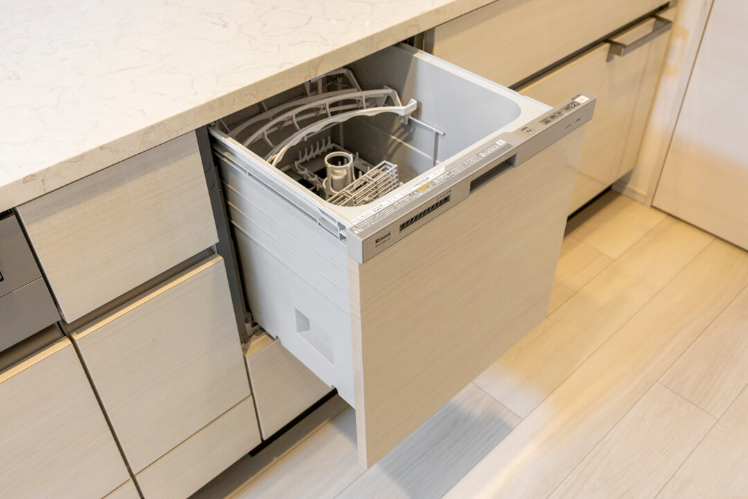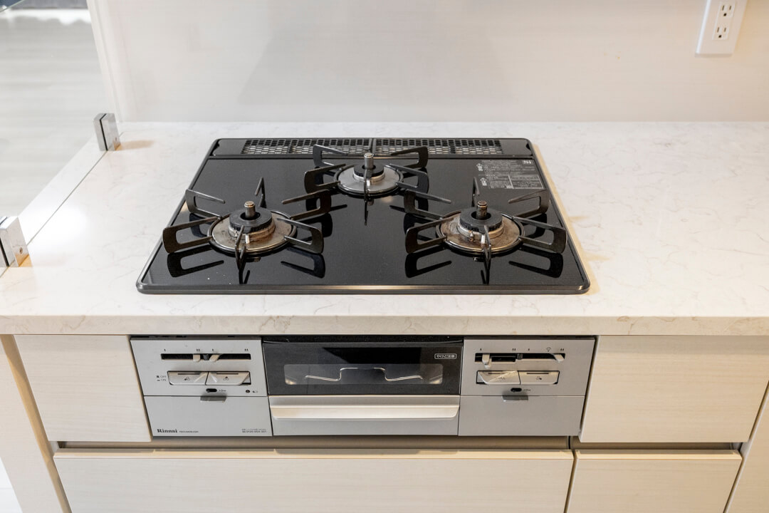 3口コンロ、グリル、食洗機付きと設備面も充実しています。シンクも広々としているので野菜などが洗いやすそうですよ。
