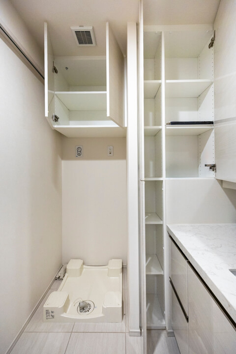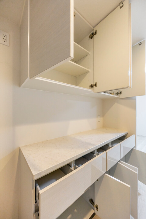 キッチンの背面側にはカップボードが備え付けられています。調味料や食器などを収納できるだけでなく、電子レンジなどを置くこともできるので便利です。