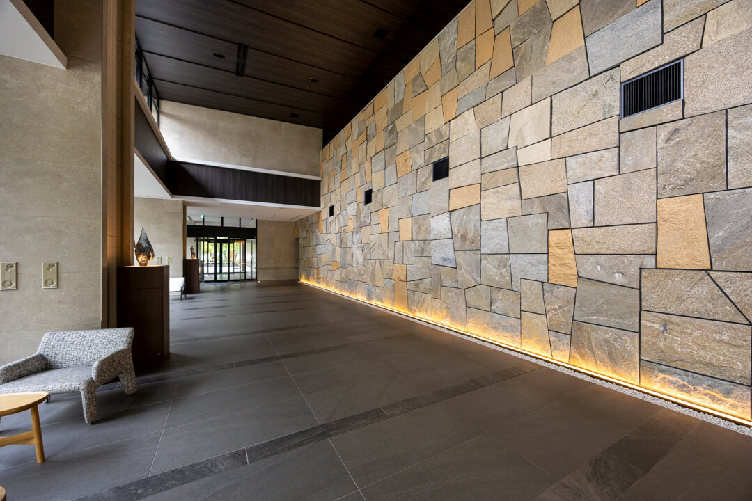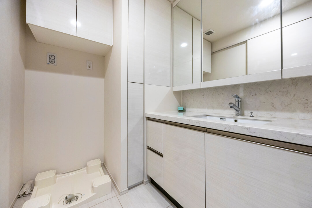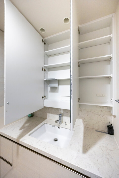 石目調のカウンターで高級感が漂う洗面化粧台です。大きな三面鏡の中には化粧品などが収納できて使い勝手が良好。横にはリネン庫が造られているので、ごちゃごちゃしがちな洗面まわりもきちんと整頓できそうです。
