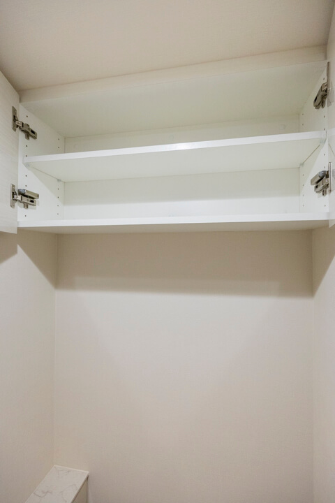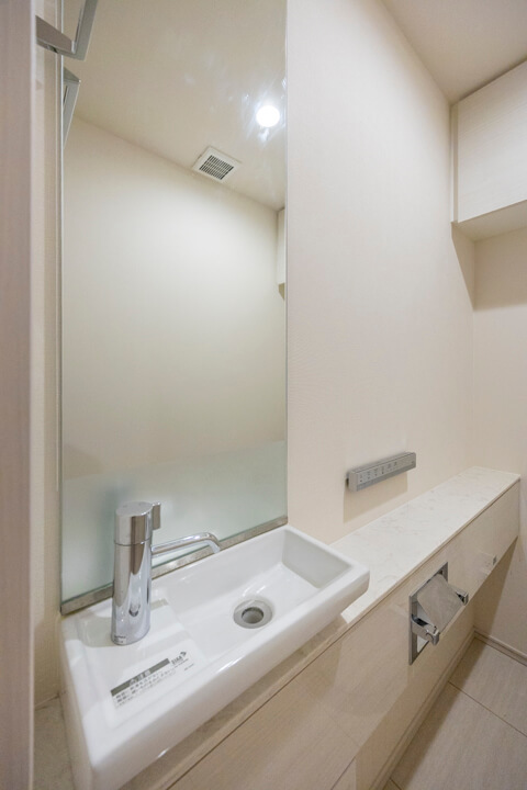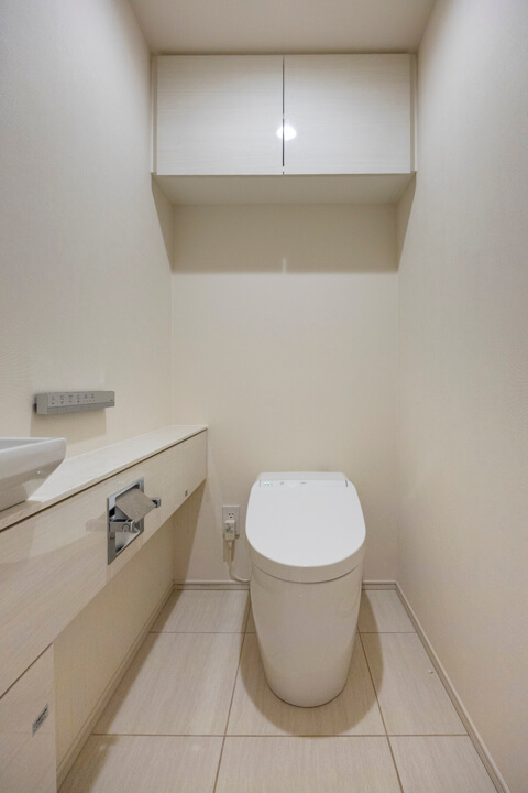 ウォシュレット一体型のトイレです。タンクレスタイプなのですっきりとした印象に。また、別途で手洗い器と鏡が造られているので、その場でサッと身だしなみを整えることができます。上部には吊戸棚が設置されていて、収納スペースもありますよ。カウンタースペースにはアロマなどを置いても◎。