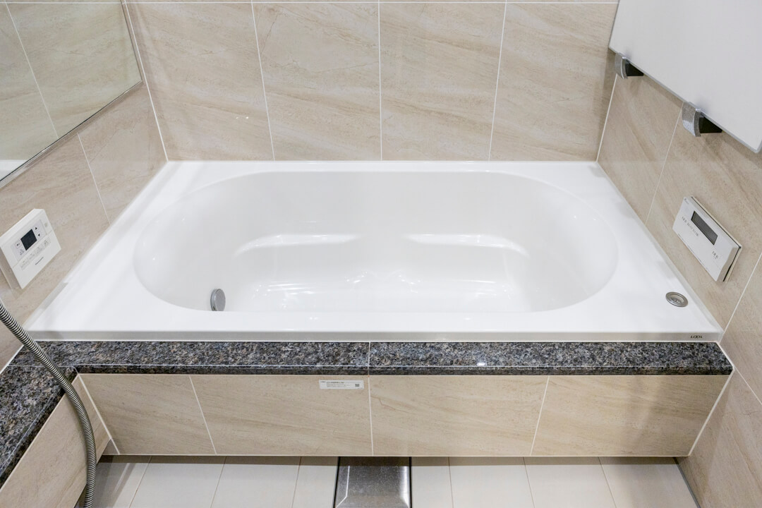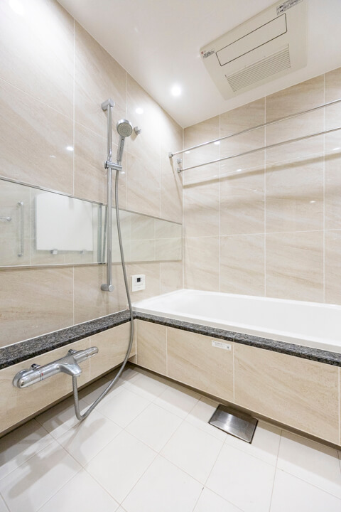 ベージュトーンで落ち着いた雰囲気のバスルームです。お風呂にゆっくり浸かるのが好きという方に嬉しい追い焚き機能を搭載。家族の入浴時間がずれてしまっても安心です。また、浴室乾燥機には暖房・乾燥・換気・ミストサウナの機能がついており、一年中快適に過ごすことができます。