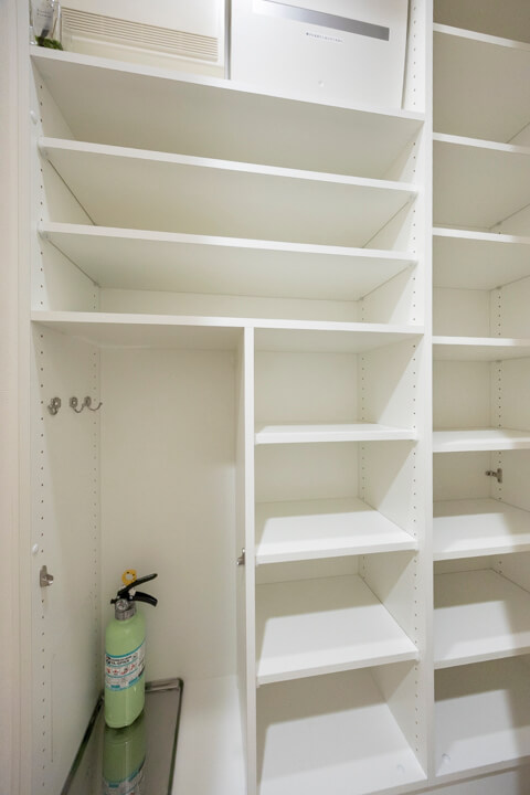 玄関入って右側にはシューズインクローゼットが造られています。中には可動棚が設置されており、たくさんの靴が収納できそうです。傘立てスペースもあって便利。
